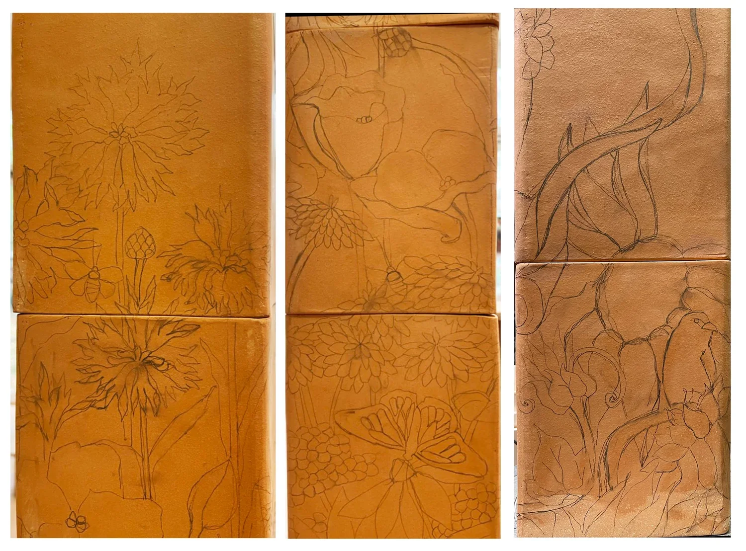 The theme continues in the tower project but not as the primary focus. Inspiration comes in waves, so sometimes you just have to wait and mull things over until it hits, then it all comes tumbling out at once. This is just two days of work, and I still have two sections to complete. I plan to finish the glazing by Friday of this week. I’m not promising.