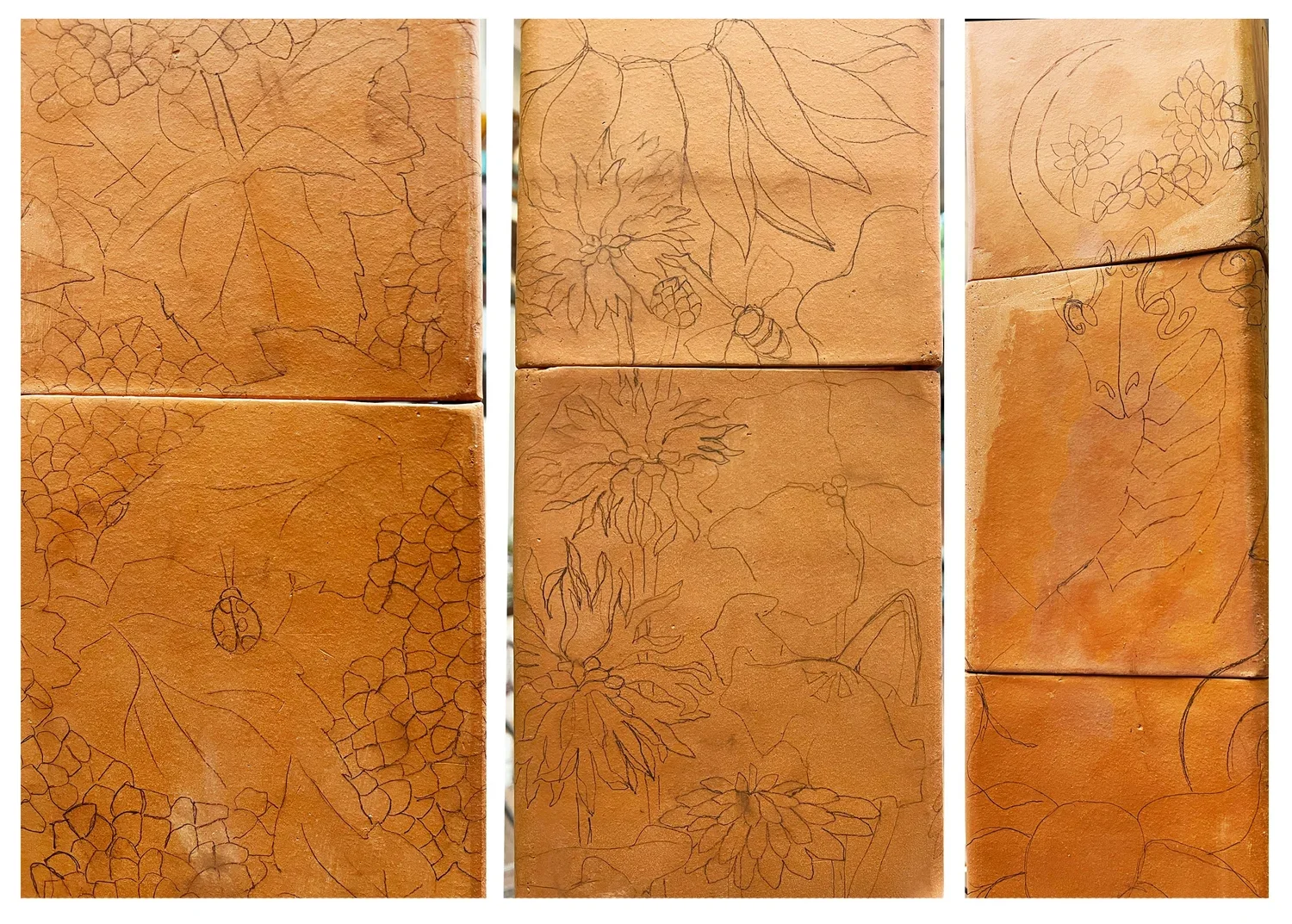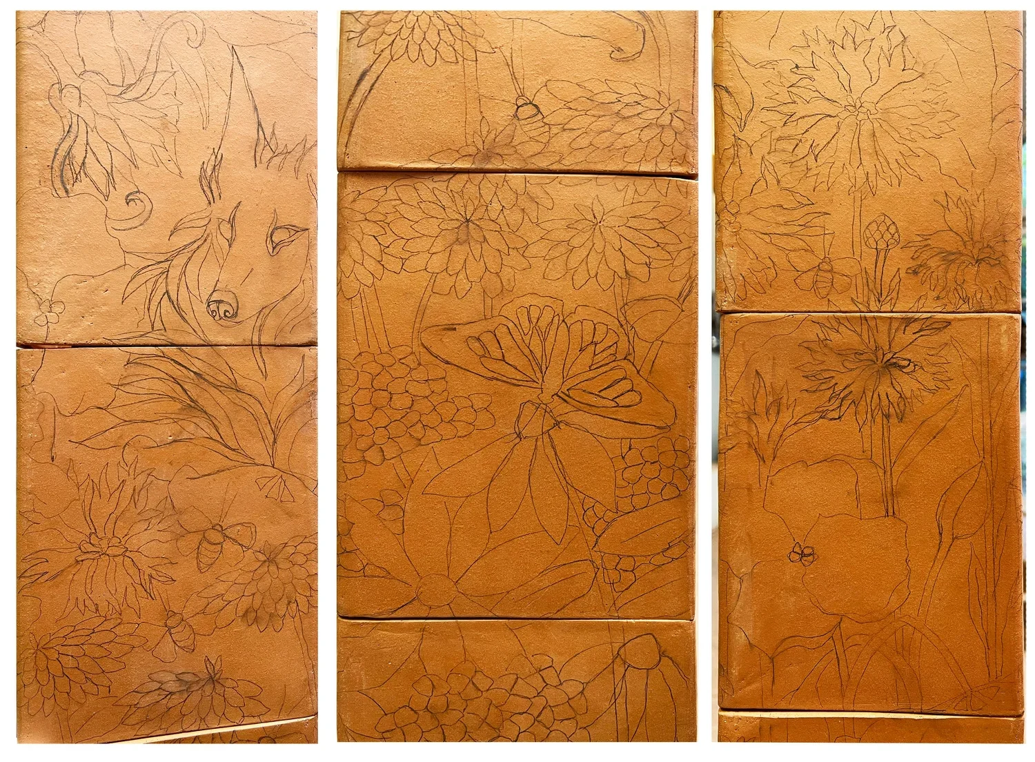 Hydrangeas, ladybugs, more poppies, and bees. There are lots of bees in this garden. I'm intentionally promoting a healthy bee population. The third image is the start of the dragon with wings of tree branches keeping with the flora and fauna of the piece.