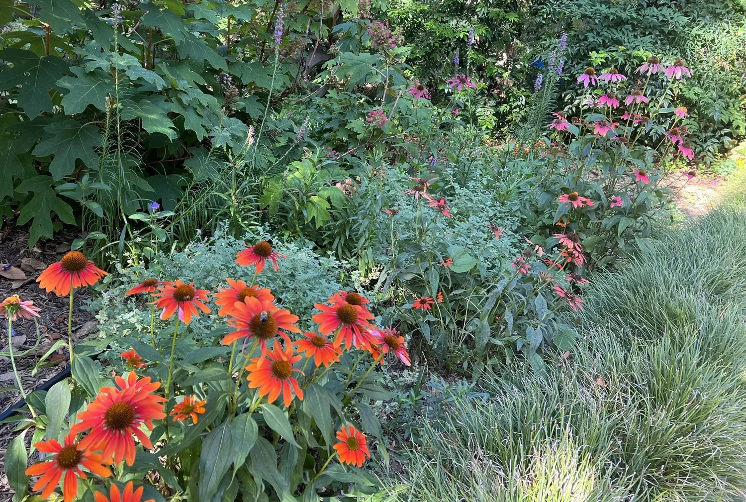 Coneflowers come in all colors these days. The first year these were pastel shades of pink, orange, and purple and have become more vibrant over the years. Black-eyed susans are another version of cone flowers, and there’s always the beautifully traditional purple.