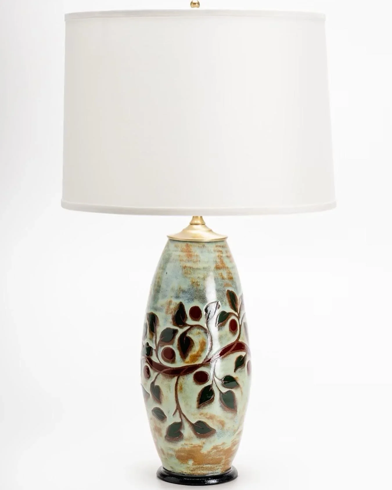 Summery green background, dark red berries and branch with glossy deep green leaves. Height with shade is 26”.
