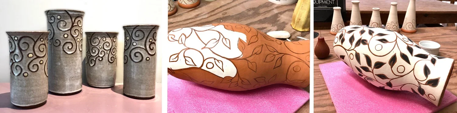 Cylinder vases with swirl and dot pattern and vase receiving an undercoat of white.
