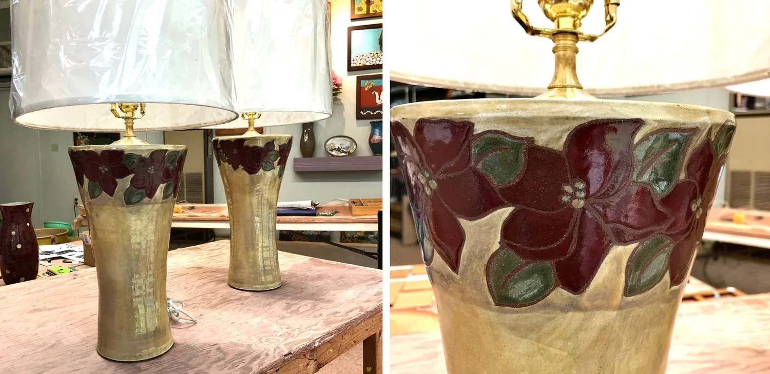 All this drawing is time-consuming, so I had a good laugh at myself when I realized I was adding more steps by painting the pots white. Some glazes are more magical on lighter clays than they are on dark ones. The color on the lamps below would have been a blah brown, to make it sing I added a white undercoat. Now it’s enchanting.