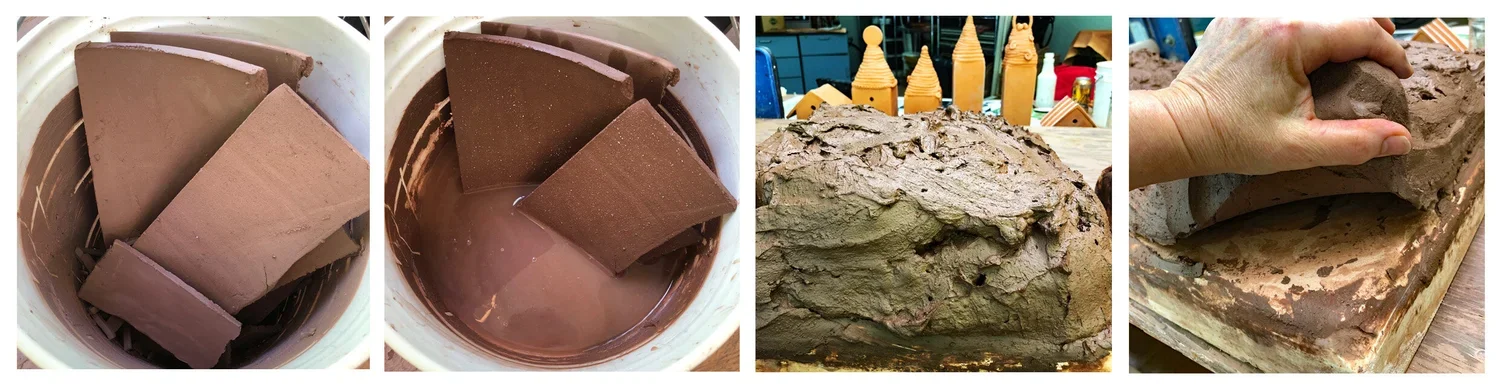 Dried clay scraps are placed in a bucket, water is added, when the clay is rehydrated, the mud is put on plaster bats to absorb the extra moisture. When the clay easily separates from the plaster, it's time to wedge.