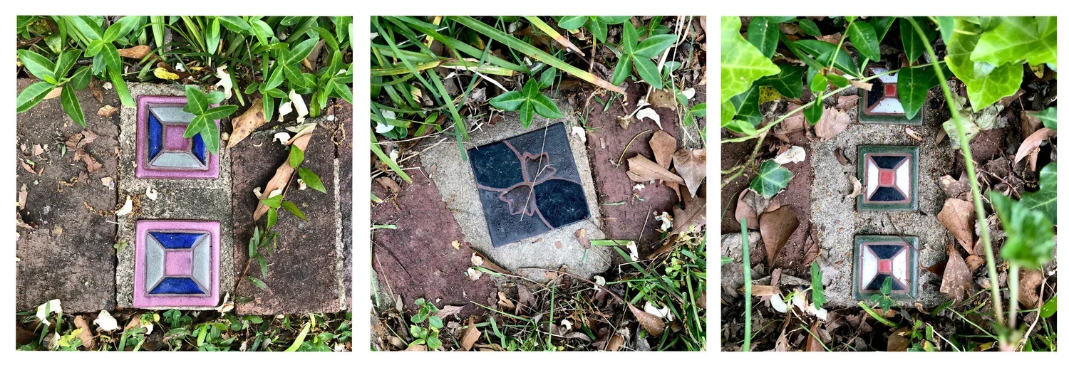 Left over tiles from various projects imbedded in concrete bricks used to line a friends walk way.
