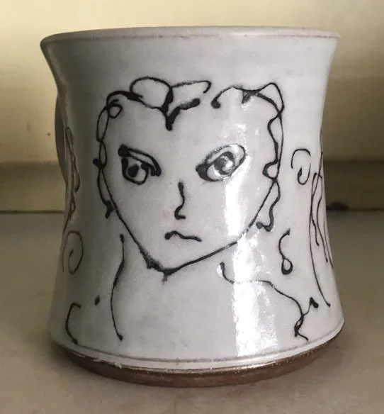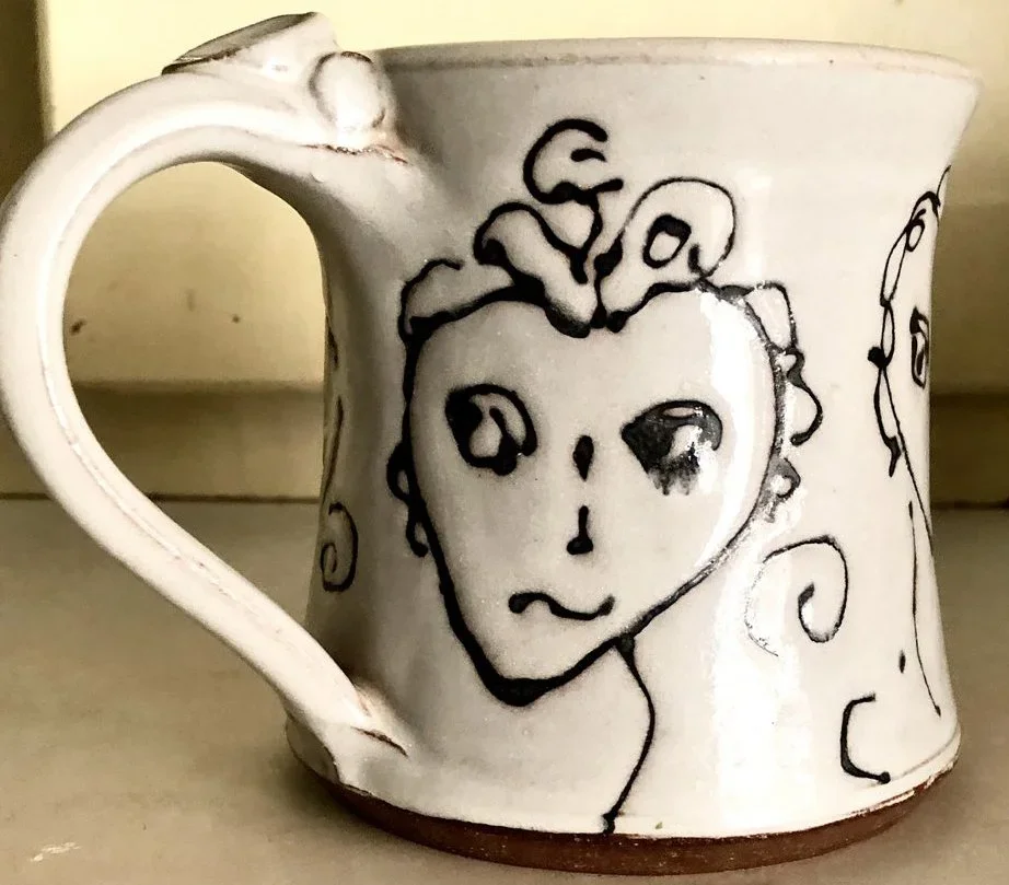 Why do we get so attached to an object? What makes an object lovable? The function is part of it, and that's easy to describe. In a mug, it's how it feels in my hands, to my mouth, and the amount it holds. But it's also a bit magic and history. The mug takes me back to my Beaufort days, a time of great happiness that ended in conflict and moved me to Asheville. The magic bit comes with being well made. How nicely balanced the cup feels when it's full of liquid, how the thickness of the clay turns the heat of the coffee into the warmth of your hands, and how perfectly the faces portray the hurt, anger, and confusion of the time. But let's end on a happy note.