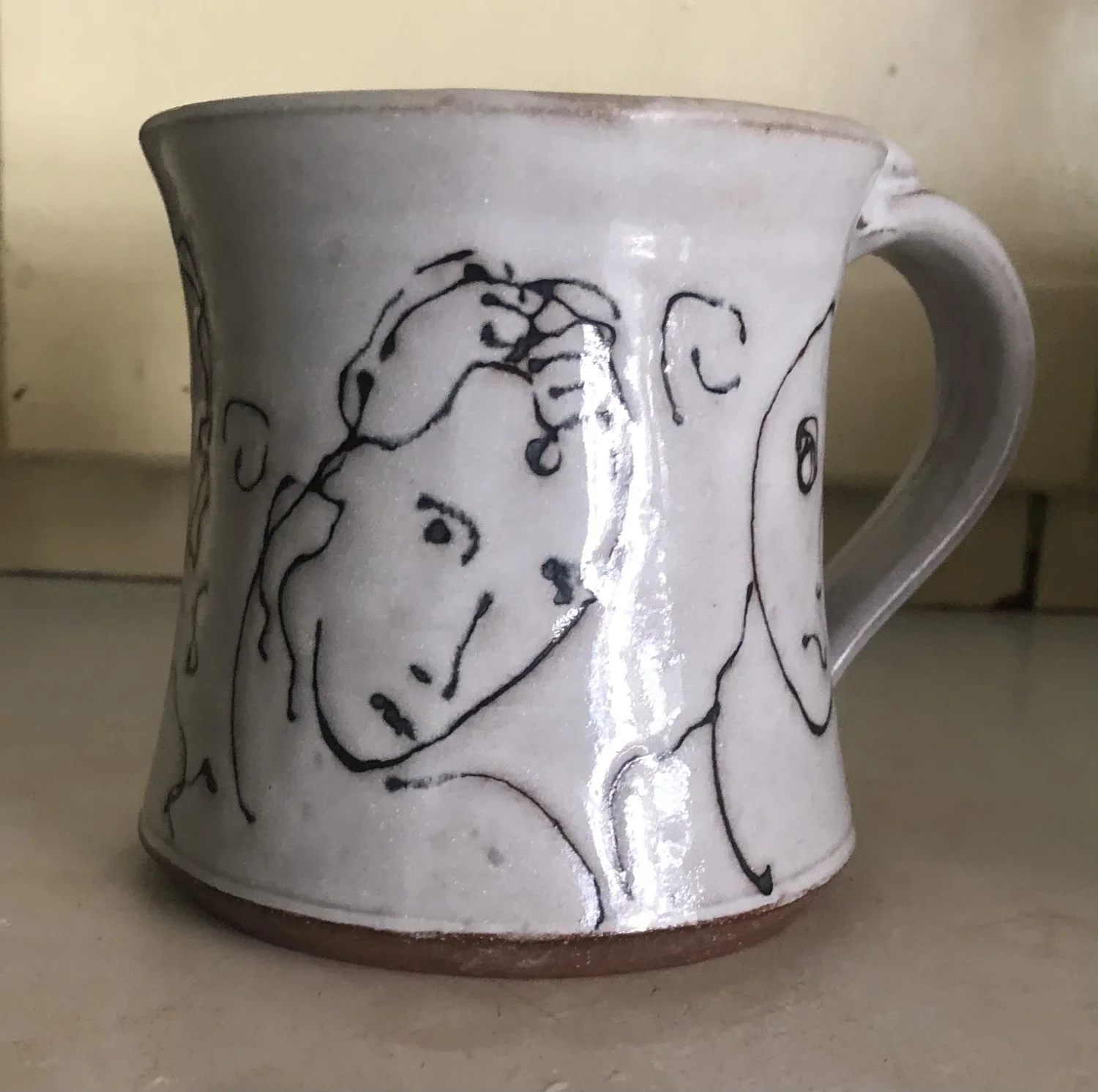 This is my favorite mug. I made it over twenty years ago. I was getting divorced; I was grumpy, my husband was following me around, and I felt my world had gotten very small. So I put my angry face around this mug. I made several of them and gave them as Christmas gifts to my family that year. But I kept this one for myself.