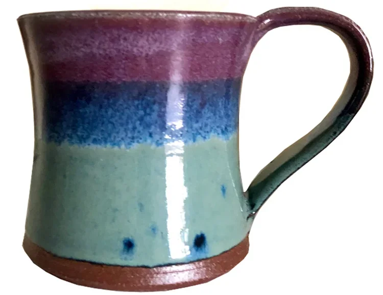 This is my other favorite mug. I like to commemorate trips with things that will bring me back to them. Last year my husband and I did a part of the Barn Quilt Trail. He was an ace driver, helping me locate and then circling back to take pictures of the quilt blocks. While in Bakersville, I visited some galleries, thinking of buying him a thank you gift. Attracted by its color, I picked this one up, and while looking around at other mugs, I just fell in love with its weight and feel. The icing on the cake was its colorful bottom. We were all doing Zoom calls, and I thought this one would add a little pizzazz to the tediousness of it all. My husband got one too.