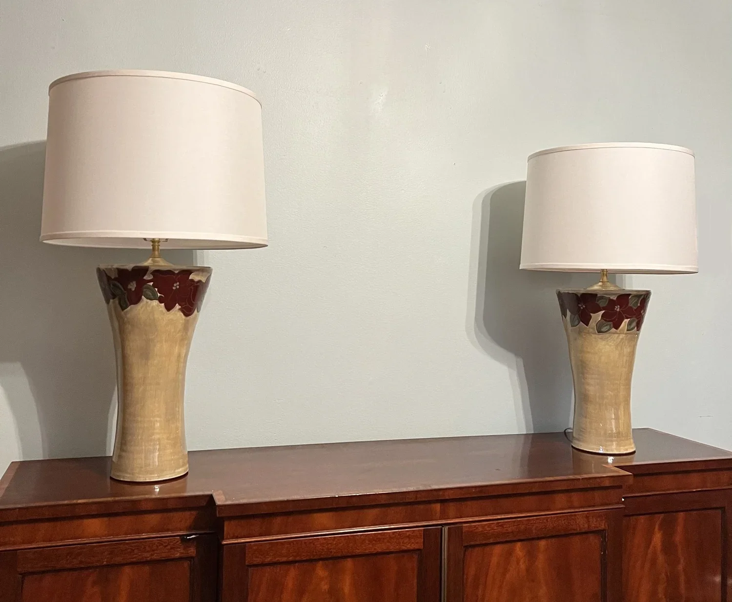 A pair of lamps in golden amber and scarlett red. None of my lamps will be perfect matches, the one on the left is about an inch taller than the one on the right.