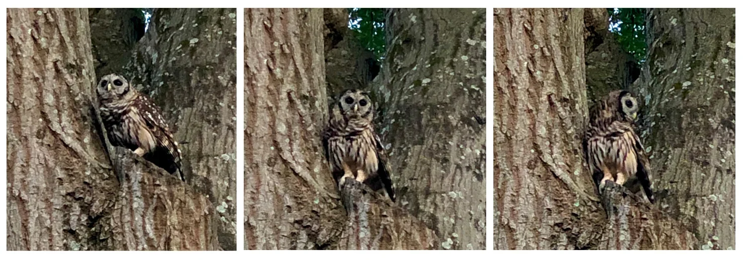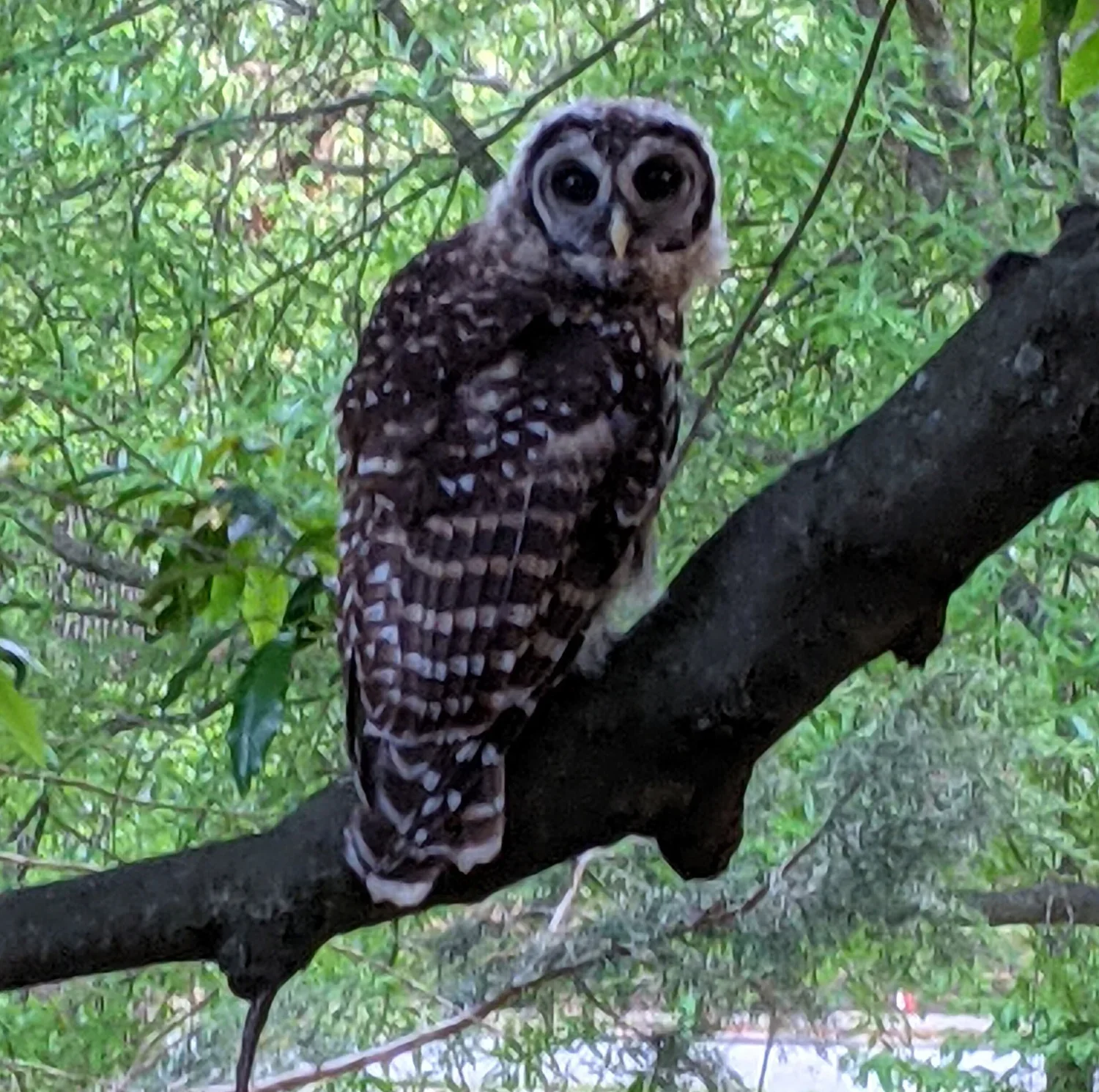 Around the time we built the deck, a pair of barred owls moved into the park next door. I'd come home and join my neighbors, watching them in the trees. Eventually, little ones started flying around the park. Like all new life, they are curious about everything, including me. I've caught them watching me work on the computer at the dining room table, working in the garden, and sitting on the roof while I have an evening cocktail. Sometimes I hear them, I'll walk out on the deck, and one will be in the tree looking down at the door. I wonder, did he just call me? It's a peaceful place; when the light is right, I'll take the laptop out there. While writing this article, I was listening to the birds, a stray worry of a bird pooping on my computer popped into my head, and darn if it didn't happen shortly afterward.