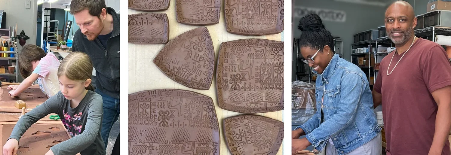A father and kids class, some plates before firing and a couple enjoying time together creating.