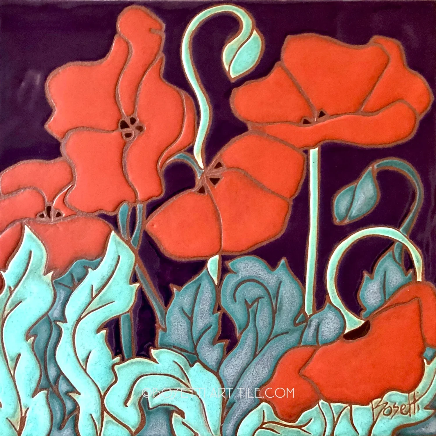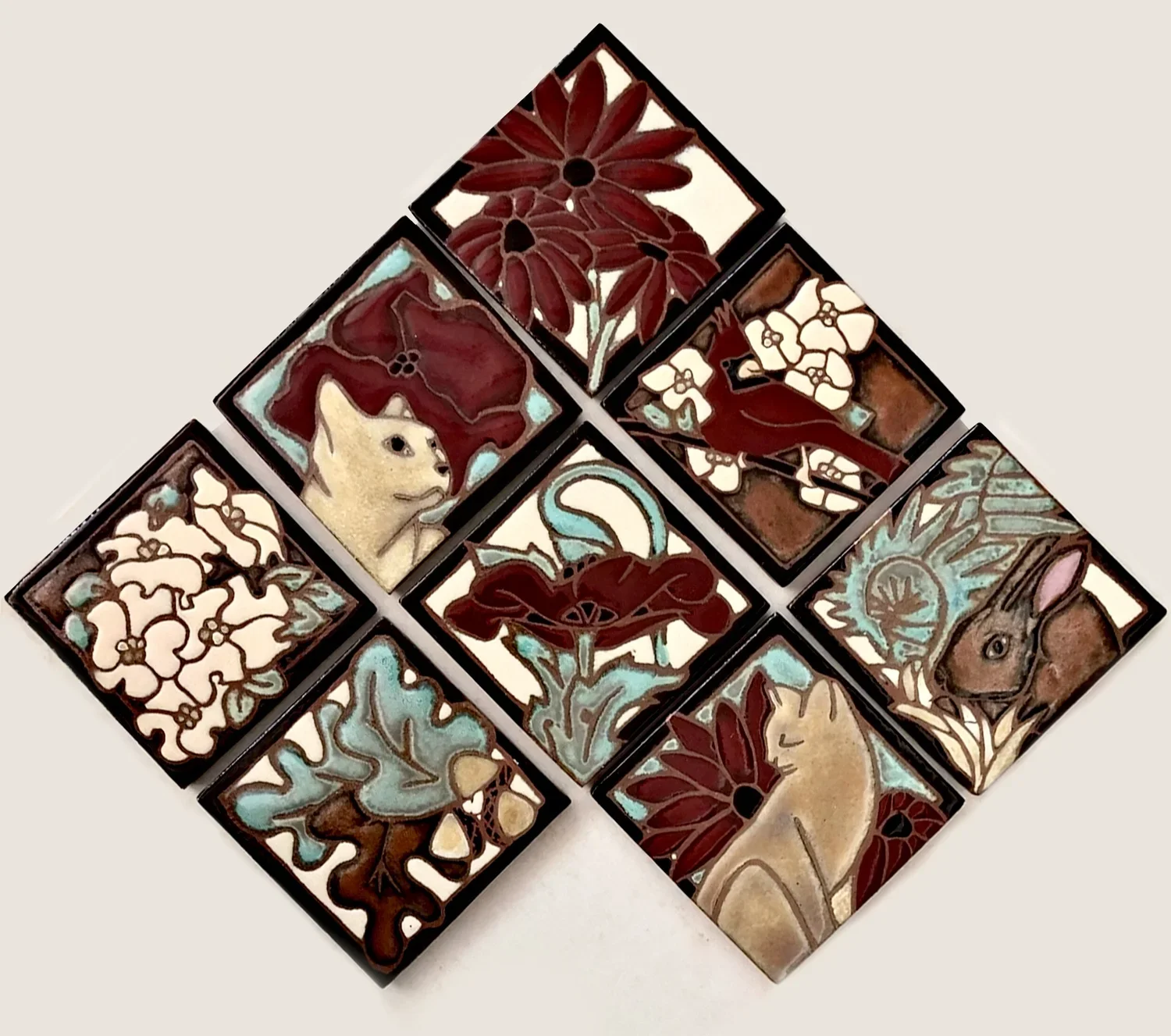 Not every kitchen backsplash I do is a mural. Some projects are small and charming, like this one from Colorful Concepts designer Sally Willams. The tile project will be eight tiles featuring the homeowner's two ginger cats, a cardinal, and a rabbit, with coneflowers, poppies, and dogwoods—familiar, simple, and well-loved motifs. When I start glazing a custom order, questions will come to mind, and I usually need a conversation with the client. While answering my questions, the customer referred to the red she wanted as garnet, and I said, "Ooh, I've got a new red that's exactly that." See for yourself.