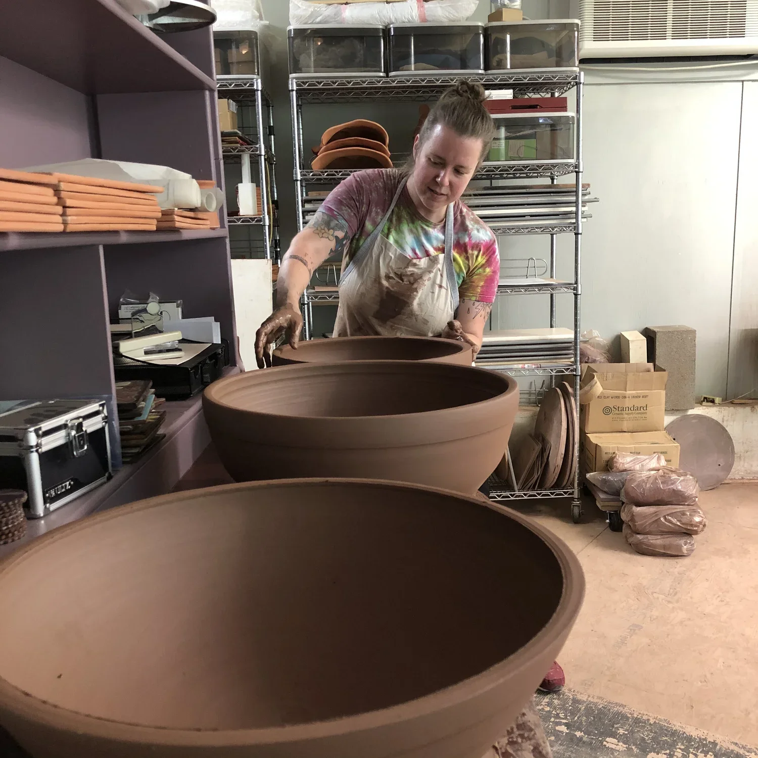 I want to investigate throwing as well; thrown pieces give you a solid and centered foundation to begin. However, throwing large isn't my forte, so I hired clay artist Jennifer Siegel to get me started. Last Friday, she came to the studio and threw three 25 lb bowls that I'll turn upside down and use as the base of the column. From there, I can add thrown or hand-built pieces to any height I fancy. Come with me on my studio staycation, and discover what evolves as I do.