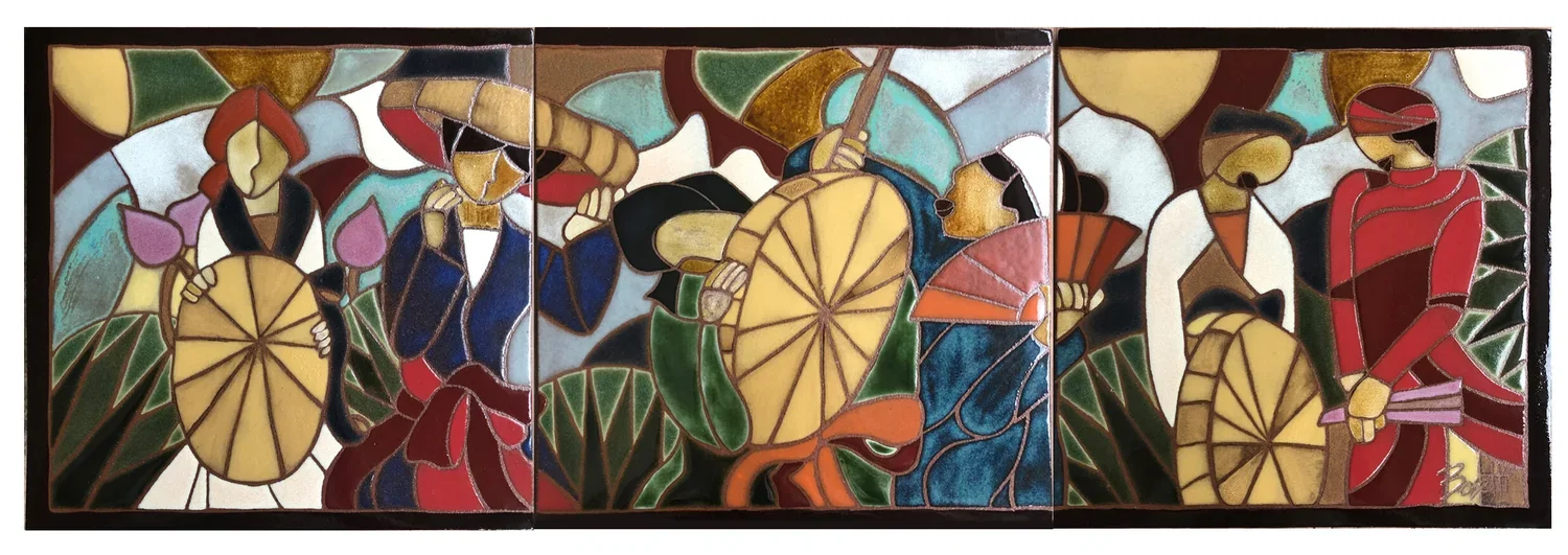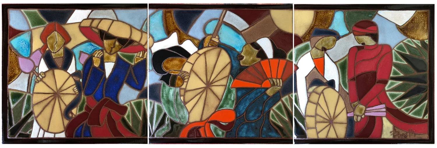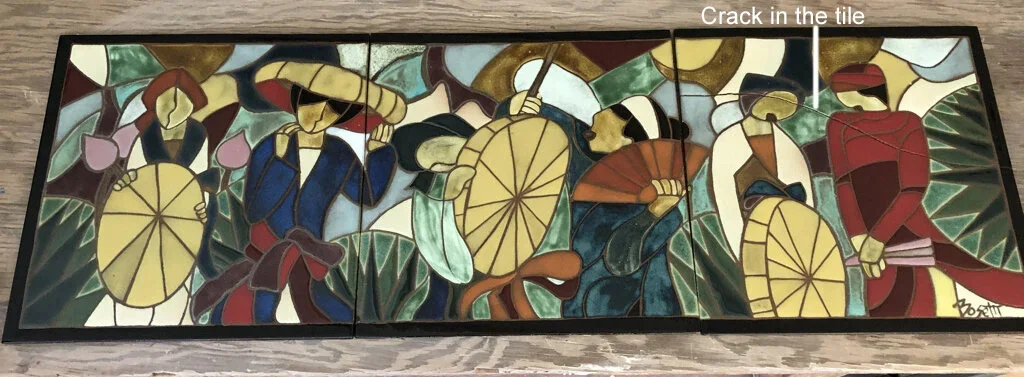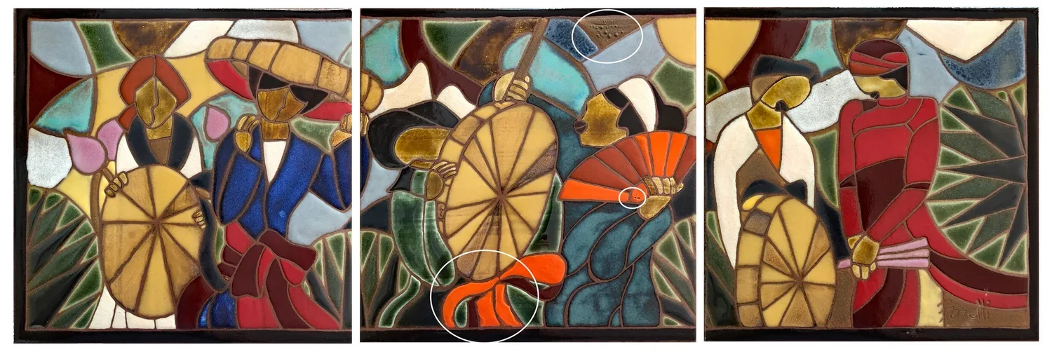 On this third set of tiles, I fixed flesh tones by adding more white and more glaze. As you can see in the photo the skin colors of the three right figures are muddy.