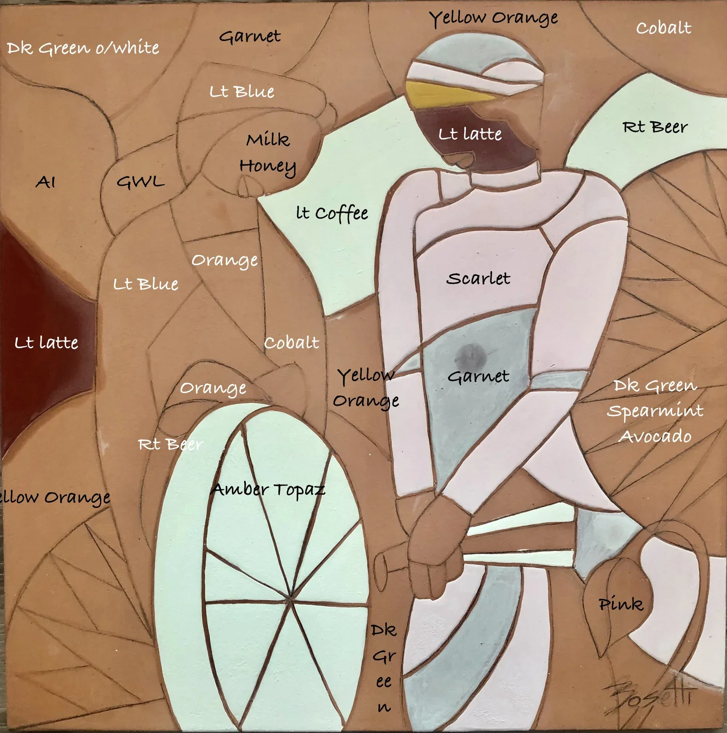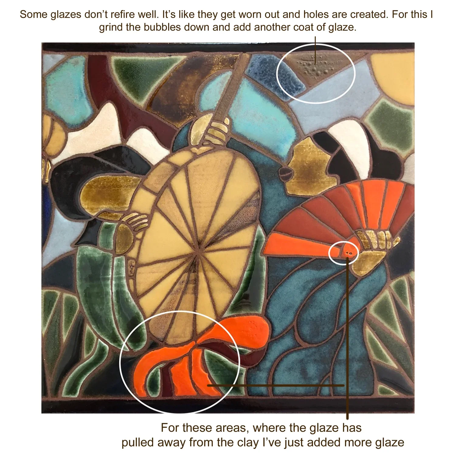 Sometimes no matter how hard you try, a project will go sideways. Ceramics can be sensitive, quirky, and unpredictable. This three-panel fireplace insert is breaking my heart. I feel I've been bickering with the glazes, which I typically think of as friends. I'm grateful the customer is focused on the design and not the time. When the project started in May, I did several color sketches, got the skin tones right, added a thin frame to the outer edge, and tested color combinations to find the best background. I used so many glazes I had to label a photograph to track what color was where. It's a great trick, one I'll repeat. I moved on to glazing the tiles for the fireplace surround.