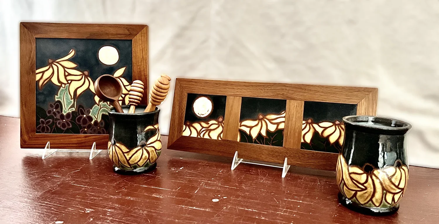 Framed 8” tile, two 5” vases, and a framed 4” tile tryptic, all with butterscotch yellow cone flowers on a midnight blue background.