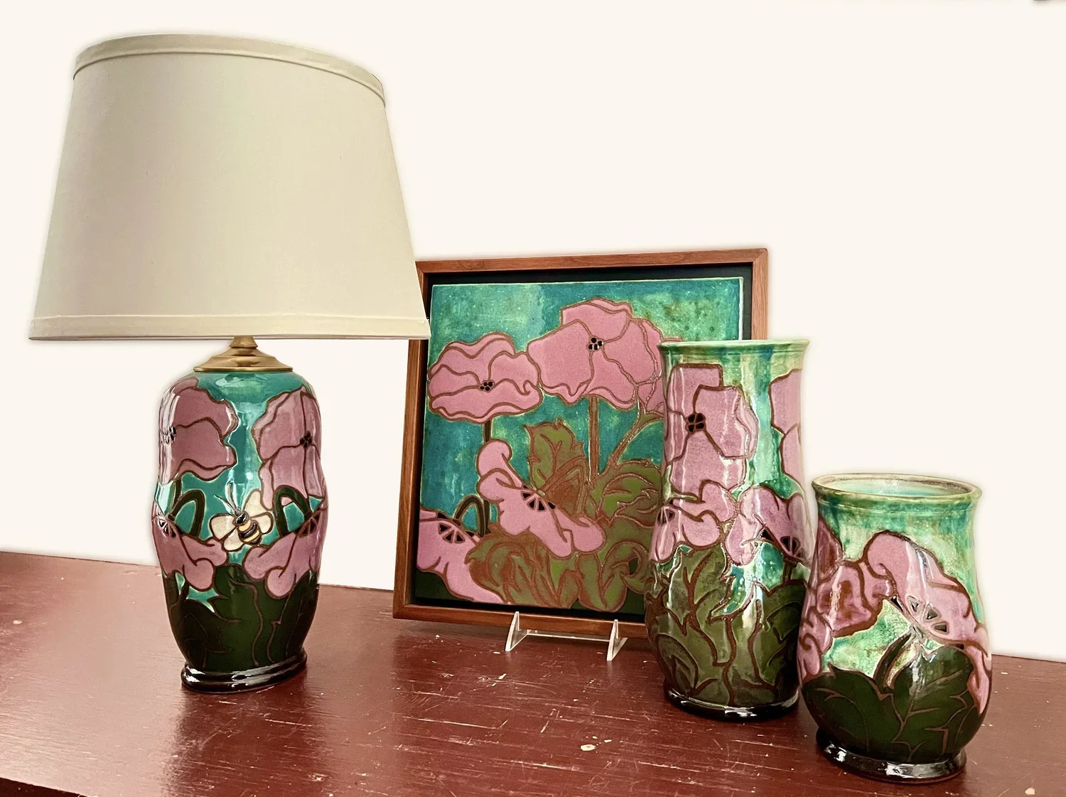 Pink poppies on a watery aqua background, lamp 20”, framed 12” tile, 11” and 7.5” tall vases.