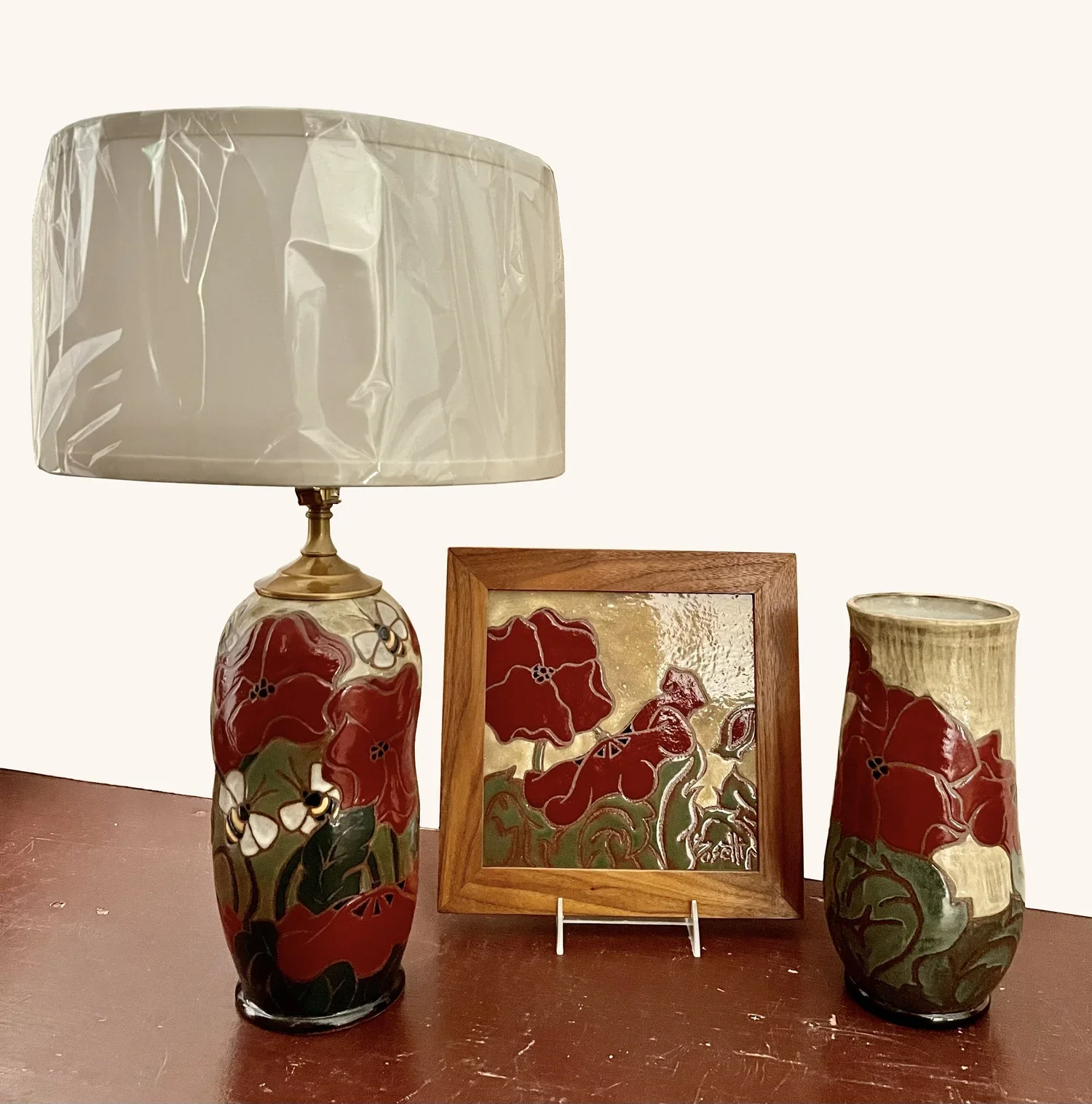 Brillant red poppies and shiny green leaves on a golden background. Lamp 20” tall, framed 8” tile, and 10” tall vase.