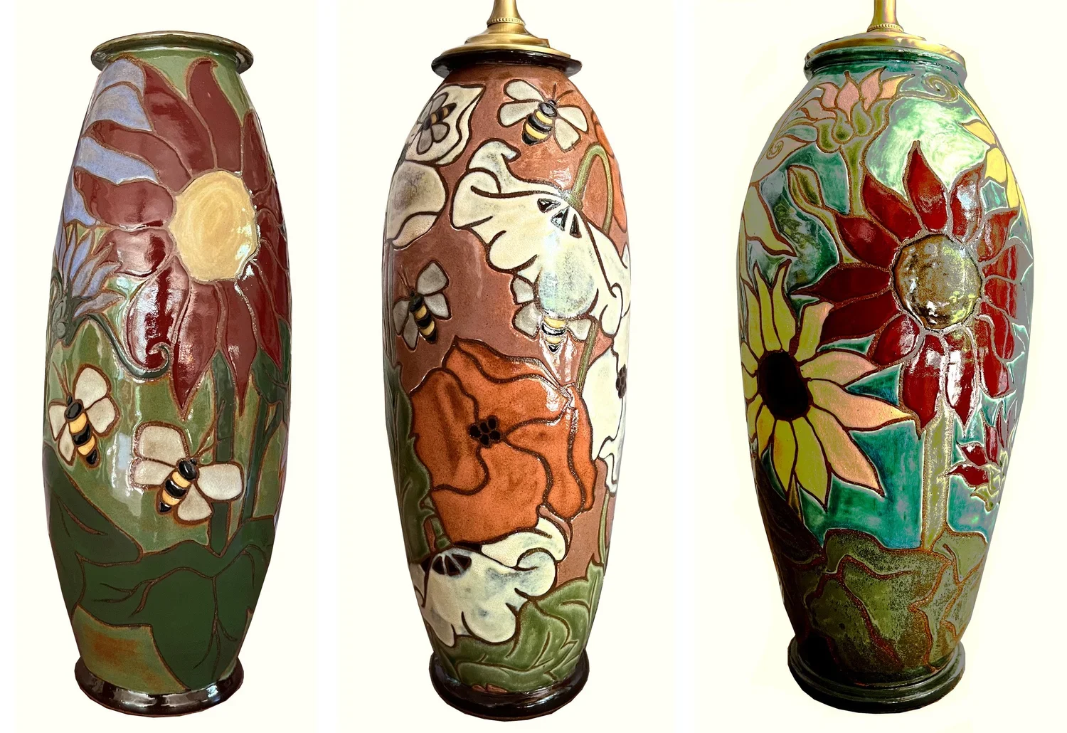 In this first lamp the new colors are the background green and goldenrod yellow in the bees. The center lamp uses sunrise orange poppies and plum over white in the background. Last are colors I’ve been using the red and blue, along with the new butterscotch yellow.