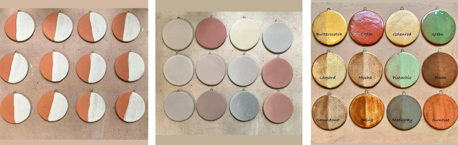 I started with some leftover ornament blanks from last year, painting the right side with white ceramic paint called underglaze, then coating them with the twelve new glazes I brought. Glaze tests are like suggestions; you only know what you have once you've tried them a few times.