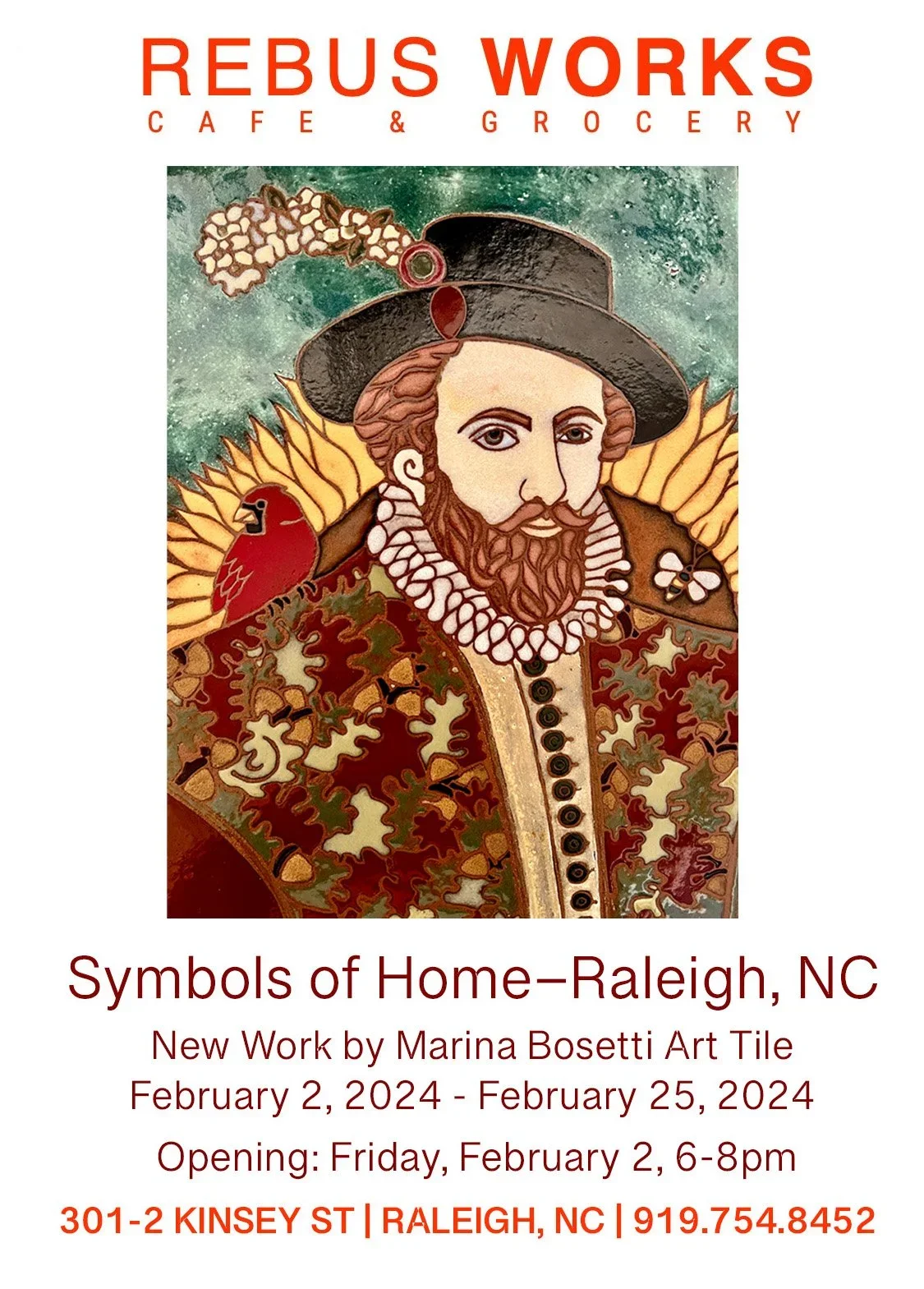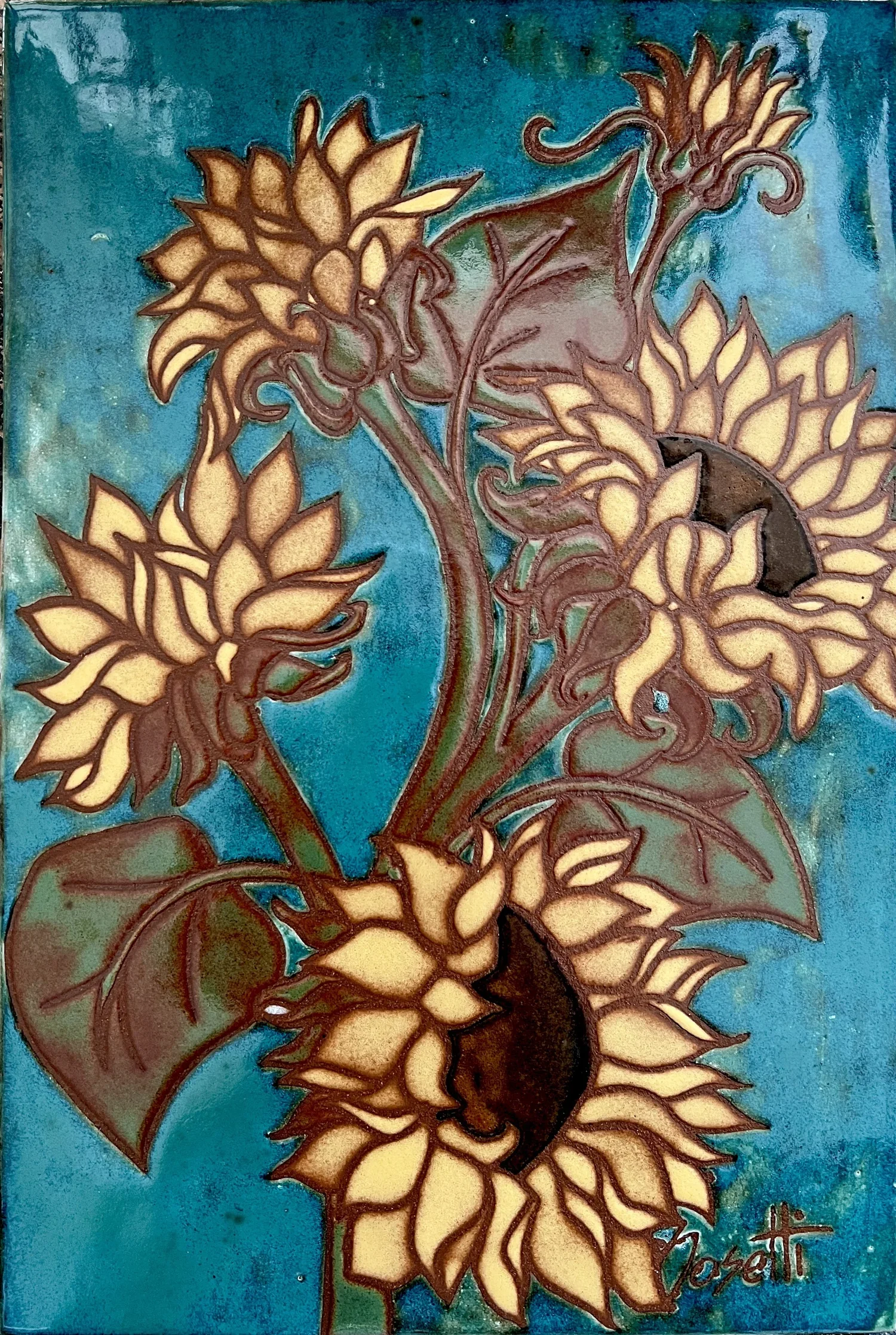 I love creating my work: the mindful meditation of cutting the tile, the challenge of composition, and the Christmas morning-like experience of opening the glaze kiln. Titling the pieces for a show is still tricky.