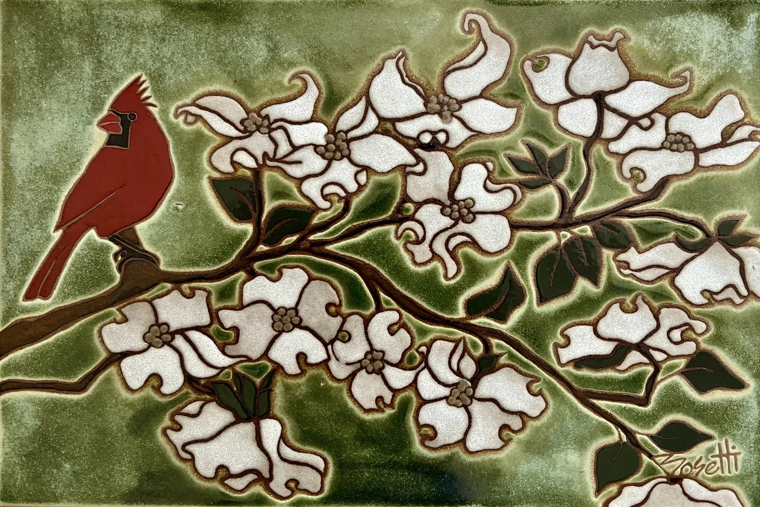 12” x 18” ceramic art tile with a male cardinal and a blooming branch of dogwood flowers.