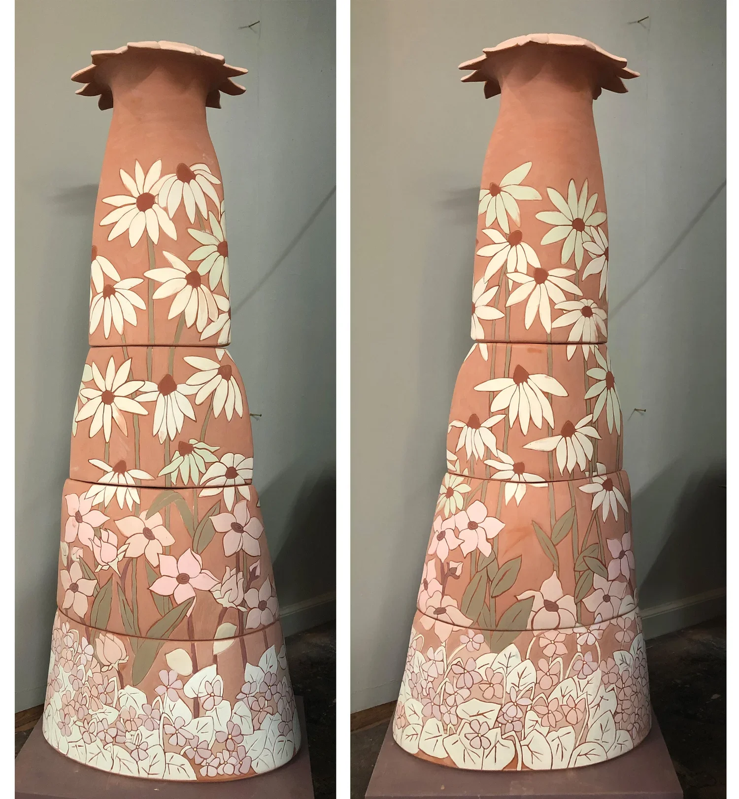 Front and back of my garden’s sculptural pedestal pre-glaze firing.