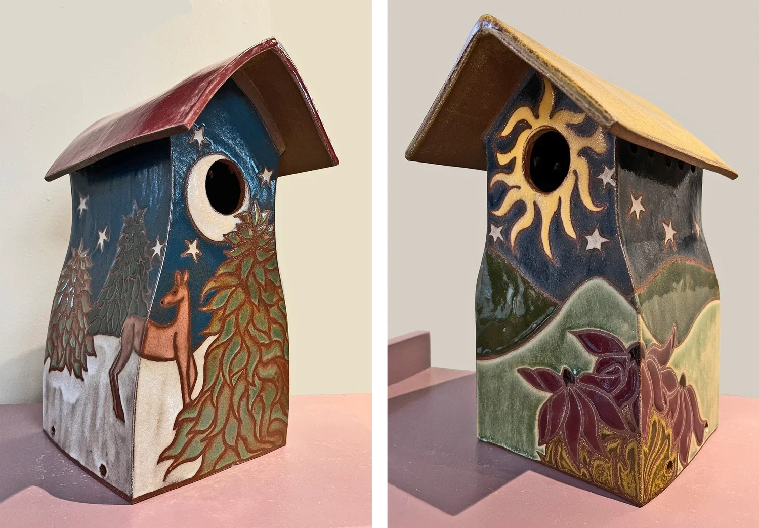 One Wintery-inspired bluebird house and one reminiscent of a late Summer evening.