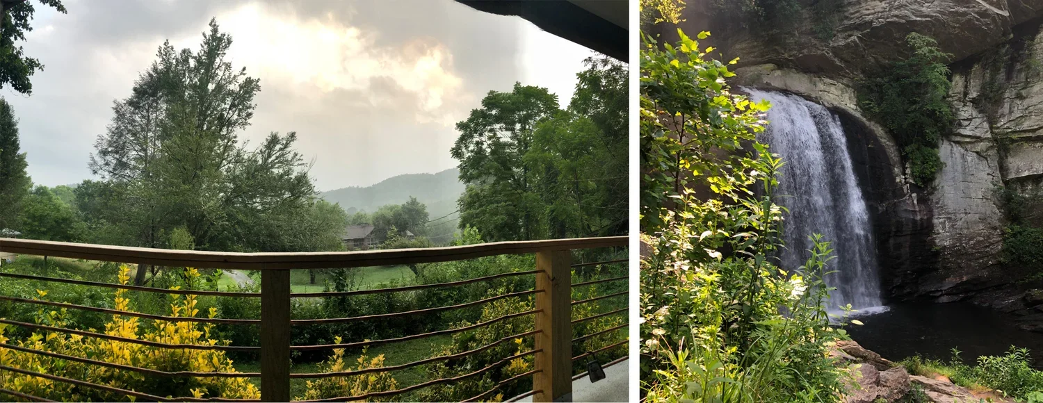 Although we didn't bring our bikes this time, we did a little hiking in the national forest to see the Looking Glass Waterfall and Sliding Rock. The forest is totally enchanting, and I wish I'd visited before I did the project. I saw most of the flora included in the tiled kitchen backsplash. Beautiful trilliums and lots of turks cap lilies. We drove to the top of Mount Pisgah and took the Blue Ridge Parkway down to Asheville. You can feel the mountain magic disappear as you get closer to I40. We had a great time.