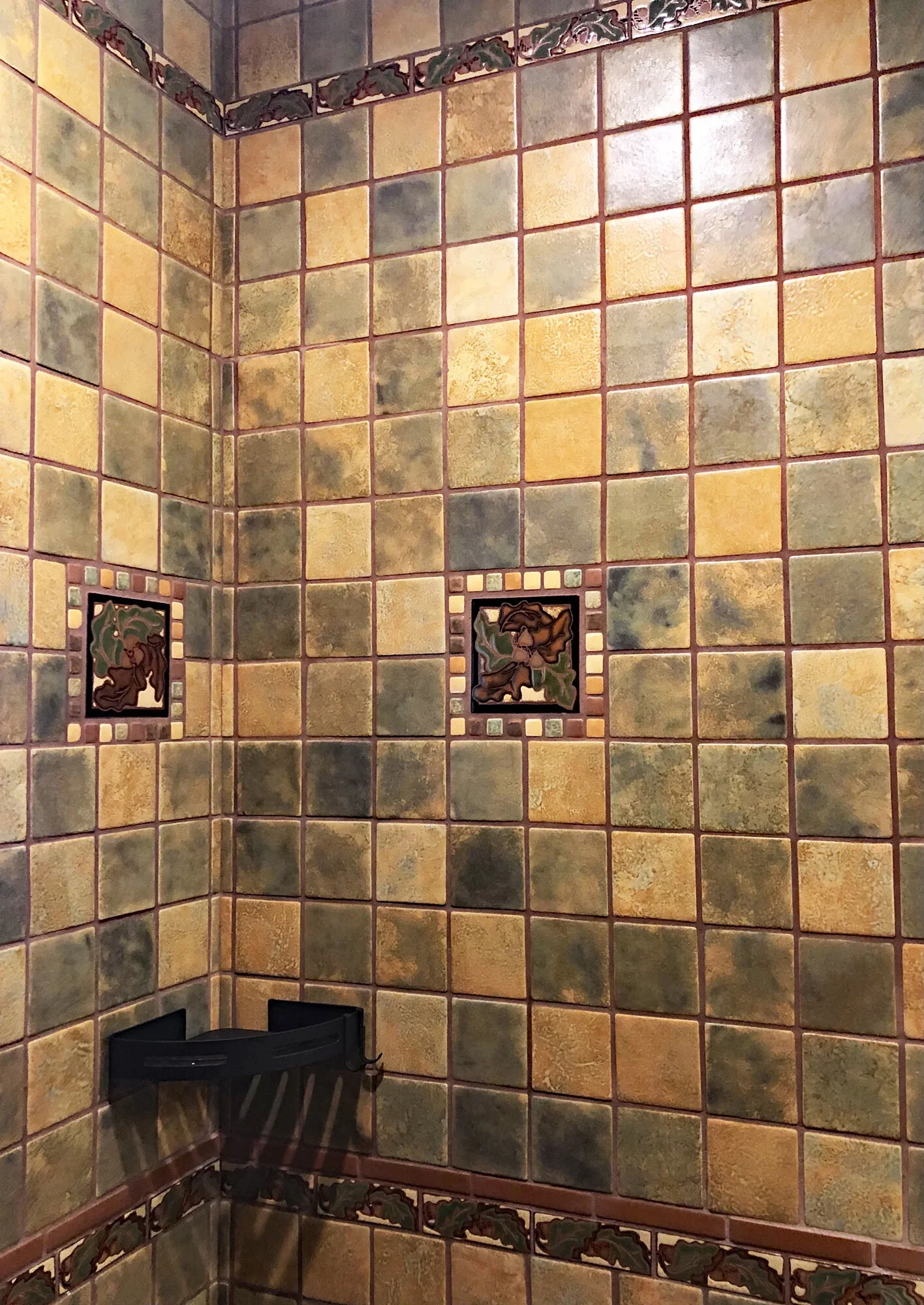 In this image you can see how the City of Oaks tiles are spaced around the shower and how the border tiles are used to frame them.
