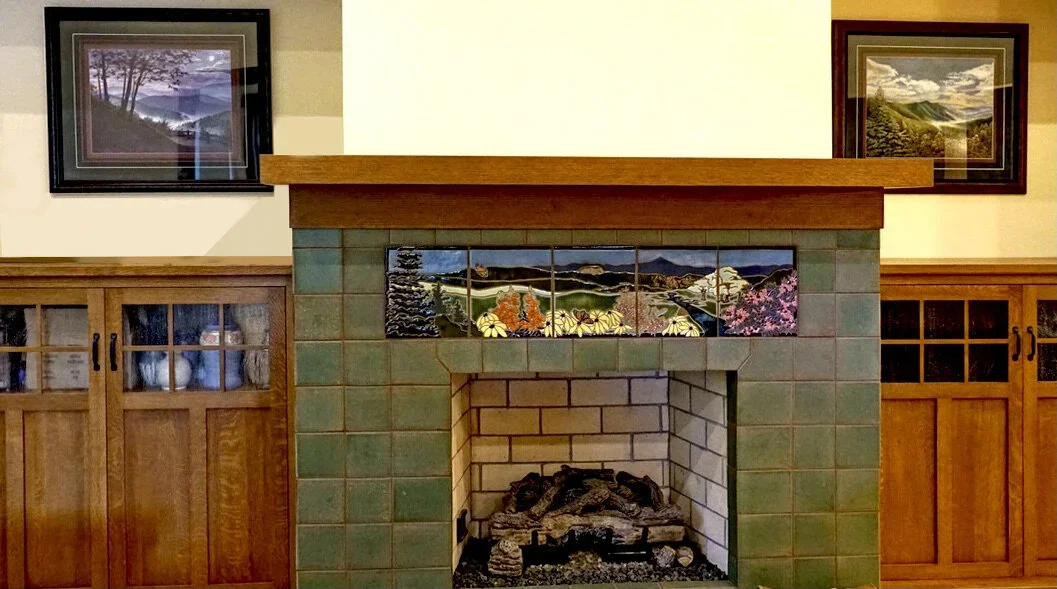 The fireplace mural features monarch butterflies, Looking Glass Rock, Mt. Pisgah, rhododendron, black eye susans, turks cap lilies, milkweed, a stream, and a few fir trees.