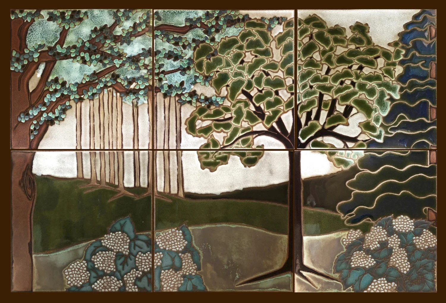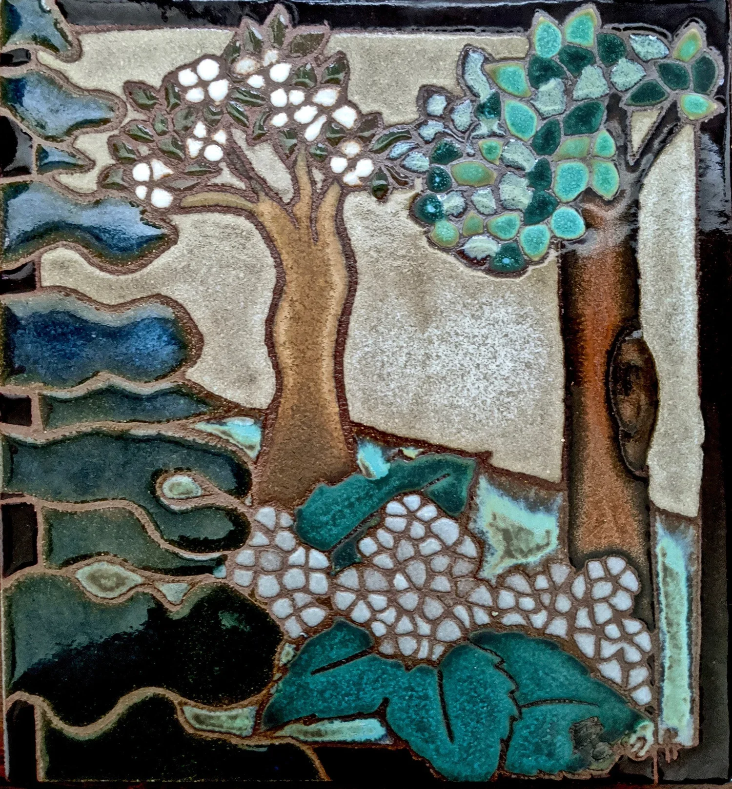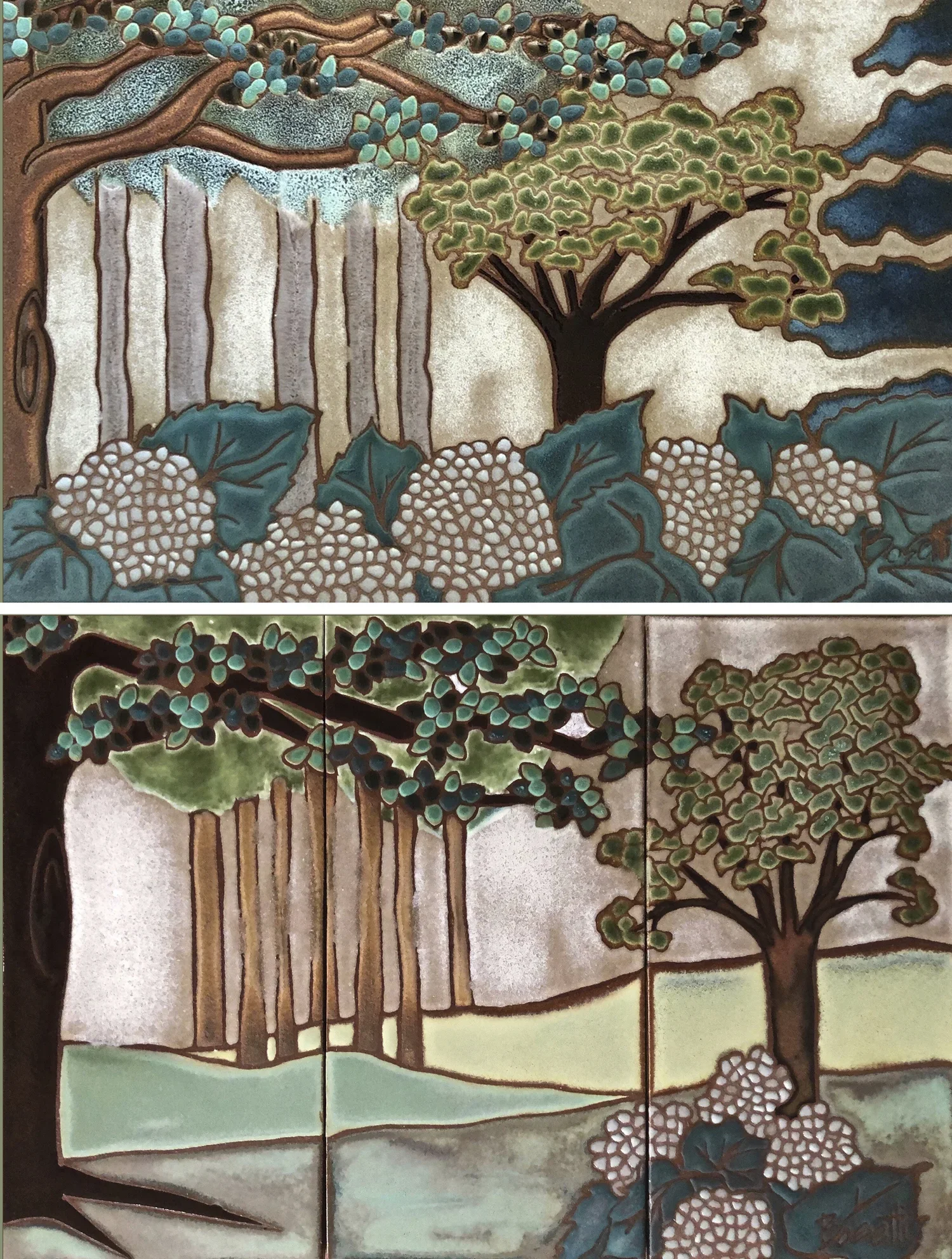 After combing my website, they found a previous commission that they liked the feel of. We talked, and I sent them a mini sample tile of what I thought they wanted. The sample was received with excitement, and we moved on with the commission. To the right is the sample, below is the 24” x 36” art tile mural before firing, and then the finished piece.