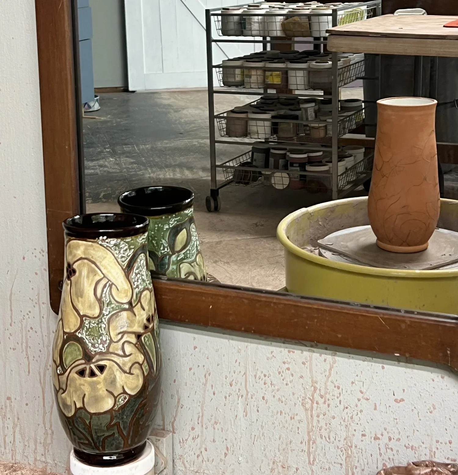 After I made this second batch, I brought the original vase back from the house and placed it in front of the mirror in front of the wheel. It's new home. The mirror lets me see the shape I'm throwing without distorting my body. That helped.