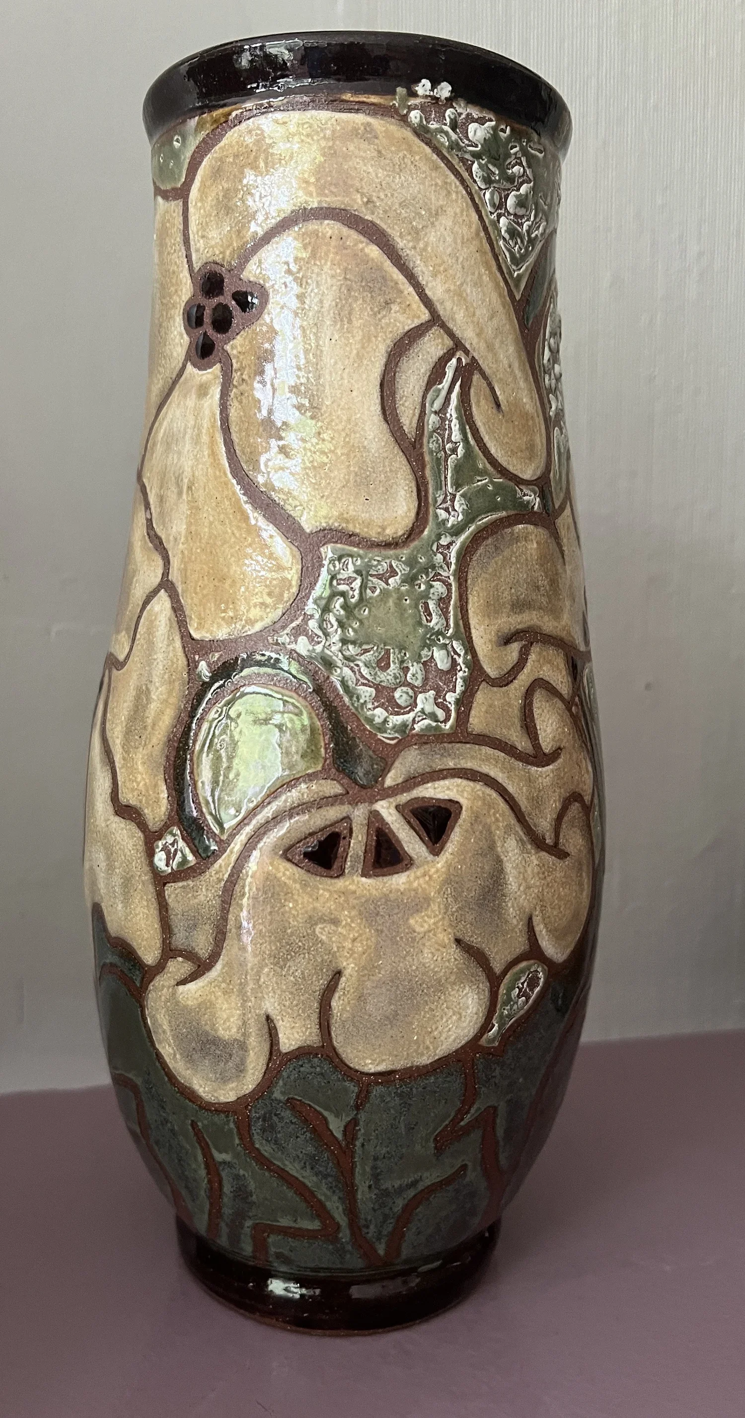 Several months ago, I made the vase on the left. Because of the glaze defects, it gets moved around the studio a lot. It is too pretty for the trash and not suitable for selling. I tried taking it home and using it for utensils, but the opening is too narrow for that. So it's living at the studio again, and I can’t stop looking at it.