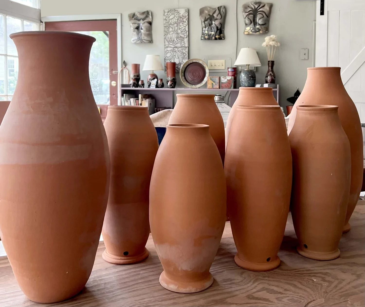 Bisque lamp bases waiting for decoration and glazing.
