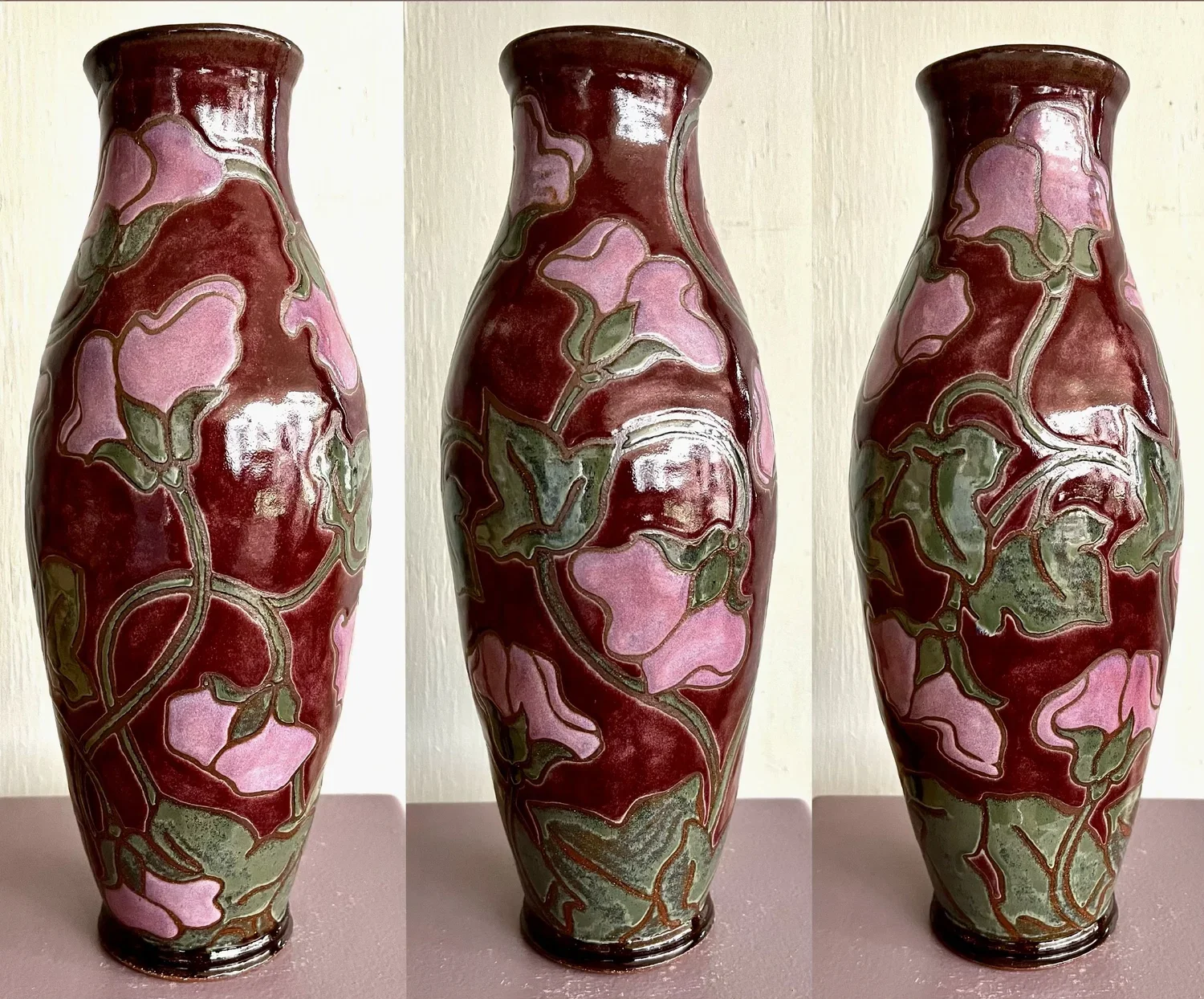This vase (about 17” tall) is an ode to Viva Magenta, 2023 color of the year, hot pink and deep plum. Another color combination I’ll be using again.