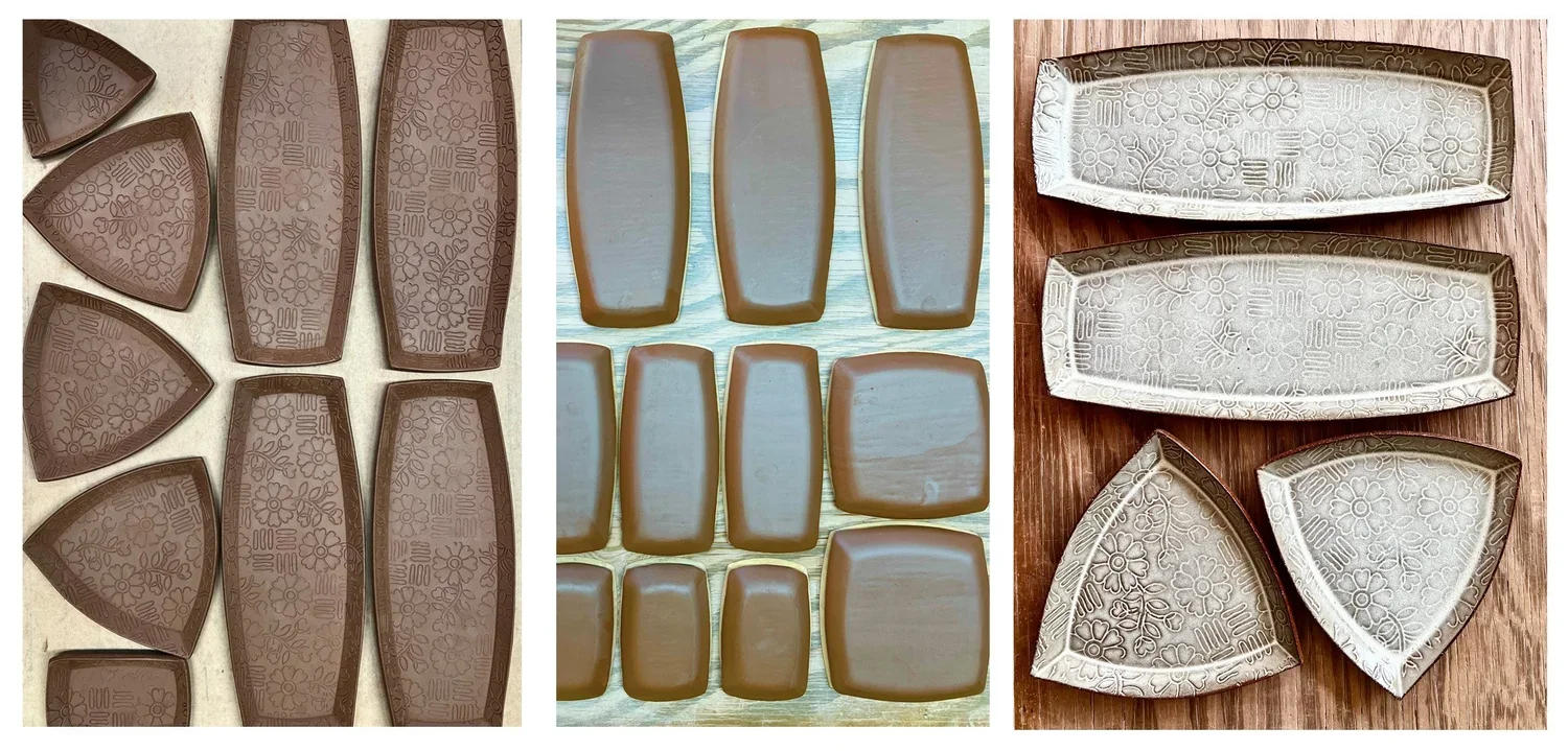 In the first hour and half of the class we texture a 3’ x 2’ sheet of clay, using molds we press the clay into plates, when ready the plate’s edges are finished, and the bottoms smoothed. After the class I fire, glaze, and finish fire the plates. You pick them up a week later and they’re ready to use, all microwave and dishwasher safe. You can also write love notes to the people you’d like to gift them to.
