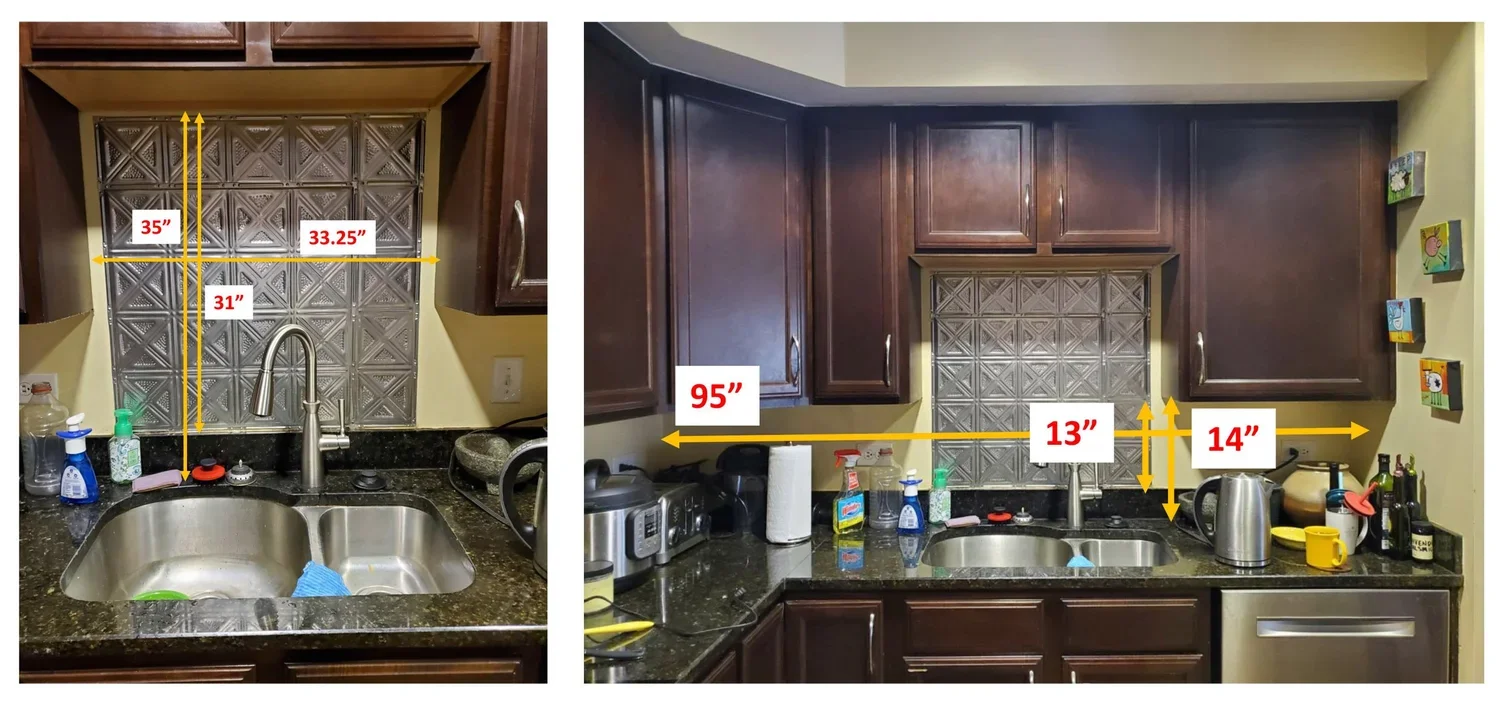 The “before” images and measurements sent by the customer at the beginning of the project. The job includes two murals, one behind the sink and one over the stove.