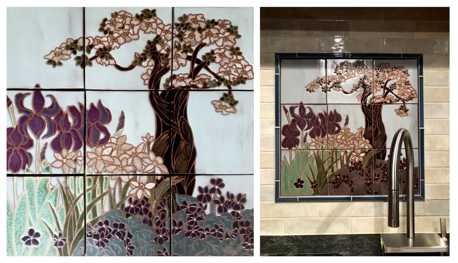 “It was great seeing you this morning! We love the backsplashes you designed for us. We asked for "Springtime in Raleigh" and you absolutely delivered. I love standing at the sink and feeling like I'm looking out a window on lovely dogwoods, irises and (my favorite) violets. The backsplash gives the kitchen so much character and brings nature into our downtown condo. I love the violets over the range and especially the custom insects you added to the tiles to represent my granddaughters Leona Grace "Bug" and Lucille Beatrice "Bee". Looking at it while cooking warms my heart. You are an outstanding artist and a lovely person to work with.” –Amy W.