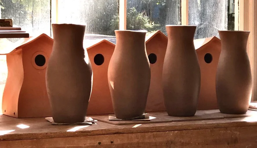 I’ve been creating like mad this month; two hundred ornaments, six birdhouses, two lamp bases, two pedestals, and four coiled vases. I’m going to slow down on the making and ramp up the glazing.