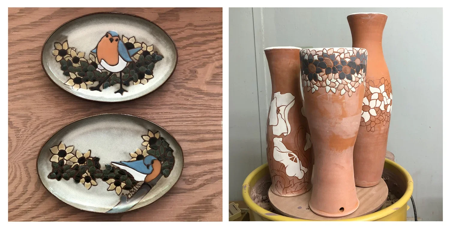When these bird plates came out of the kiln, I couldn't stop marveling at how fresh and Springish the colors felt. The honey-colored flowers are a new color that needs a coat of white underneath. You can see the white undercoat on the vases in the image on the right before the glaze is applied.
