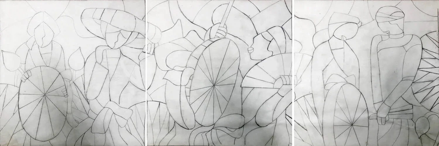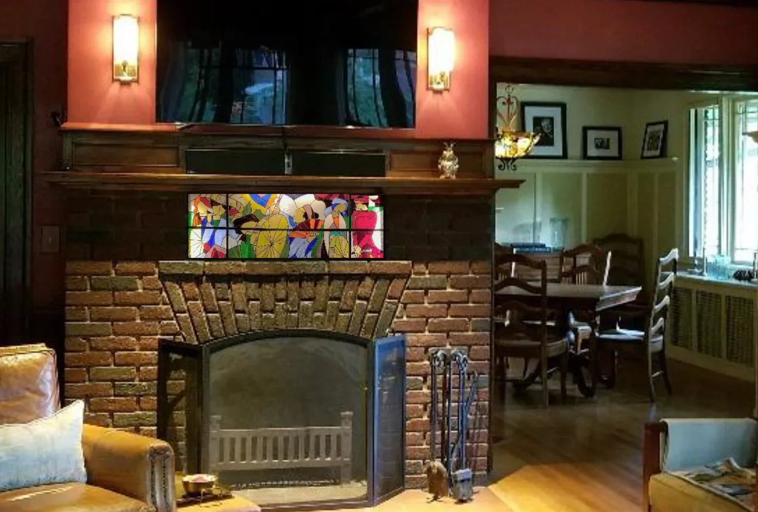 The imagery wasn't a perfect proportional fit for the fireplace. To create what the customer wanted, I made some adjustments to the composition. I moved the figure on the far left over to fill the space and moved the figure in the foreground higher to include the bright orange bow, trying not to break the vibration of the original piece.