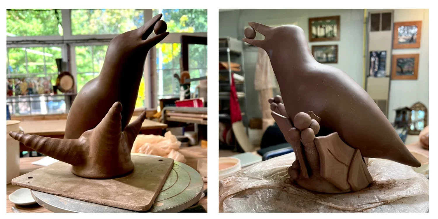 My studio mates, Xena Electra Ceramics and Liz Kelly Pottery, will also demonstrate. Liz will be throwing outside, Xena will be pinching, and I'll be coiling birds and demoing my glaze technique.