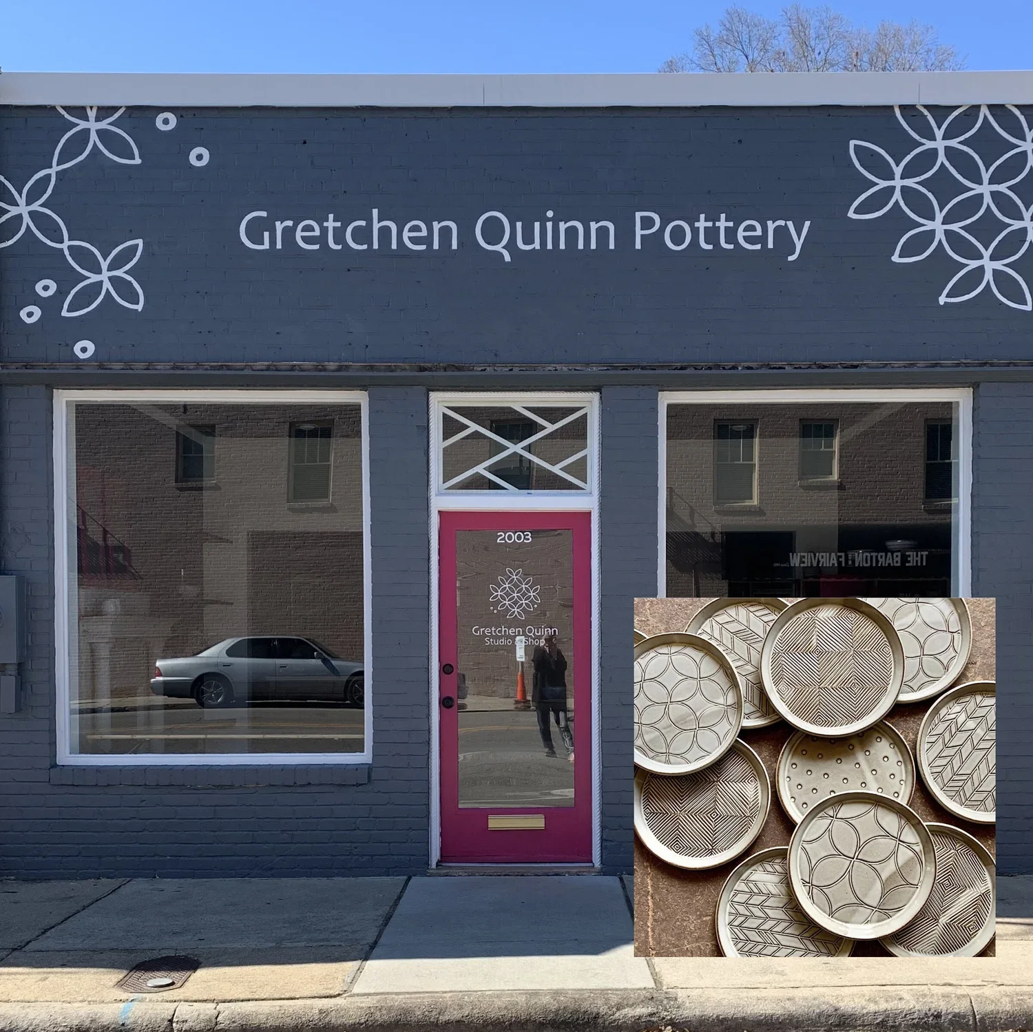 Gretchen’s new studio space on Fairview Road in Five Points, with an insert of her carved patterned plates.