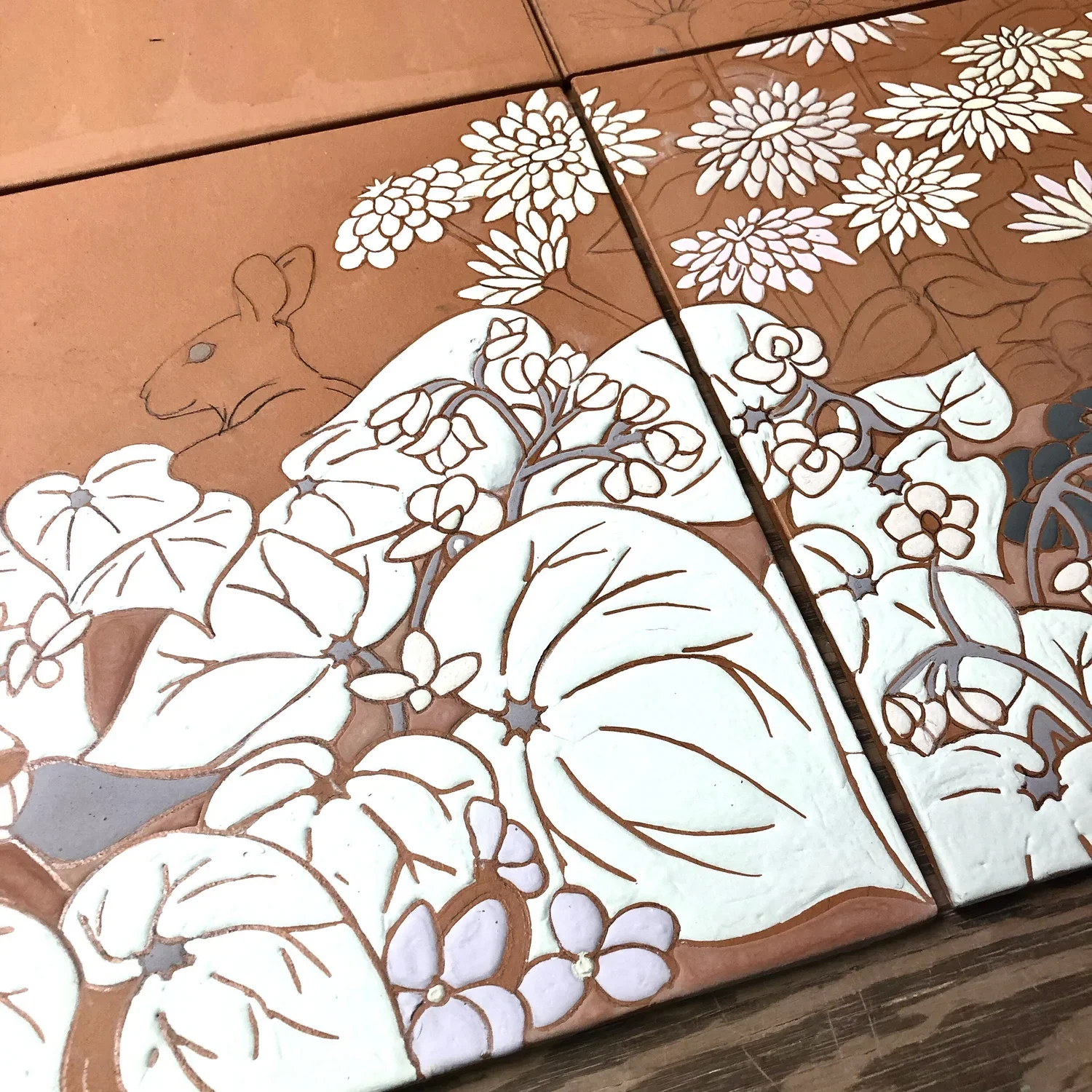 The mural for the cancer center is nicely underway. I've drawn 14 of the 24 feet and have started glazing it. It's hard to see the drawing on the bisque tile. By glazing, I can see the sections I'm sure of while still adding other elements. I've started making and testing some new glaze colors. The results are rewarding, and my initial nervousness has turned to fun.