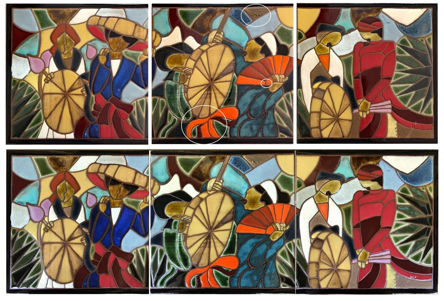 The top image is from last week showing the glaze flaws. The bottom image is the same mural re-fired. You can see I was able to fix the orange glaze but only minimize the brown region.