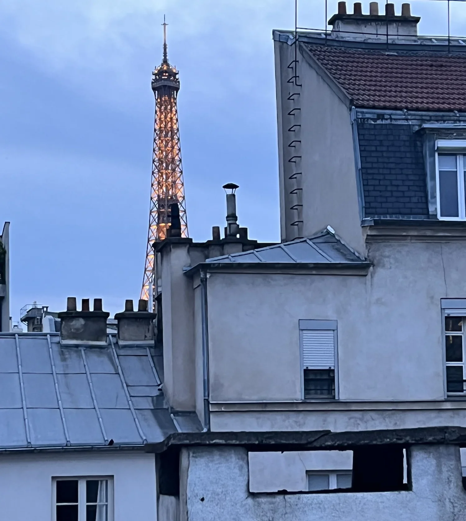 The picture to the left is our view of the Eiffel Tower from the patio of our hotel room. Another perk of the hotel was a full-size bathtub. There's nothing like a soak after a long day of sightseeing and walking or after a few hours of writing.