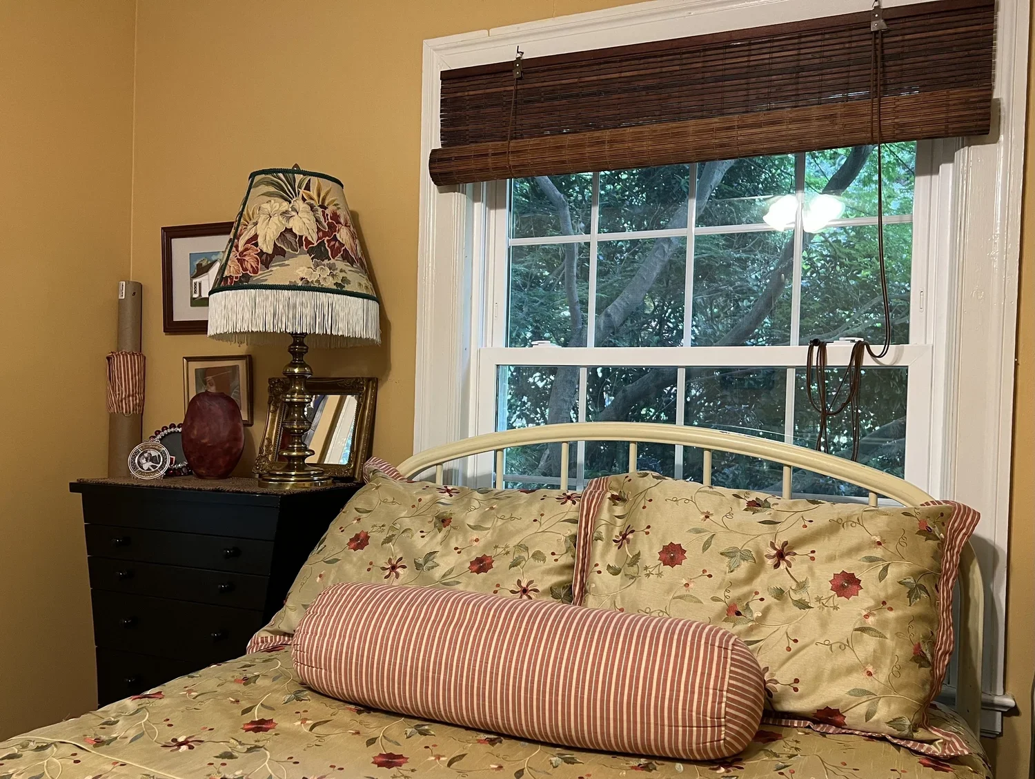 Here’s the new bedspread. The wall color will go from harvest gold to a cool pastel green. It saddens me that the lamp shade will probably have to go but I’m going to decide once the walls are painted.