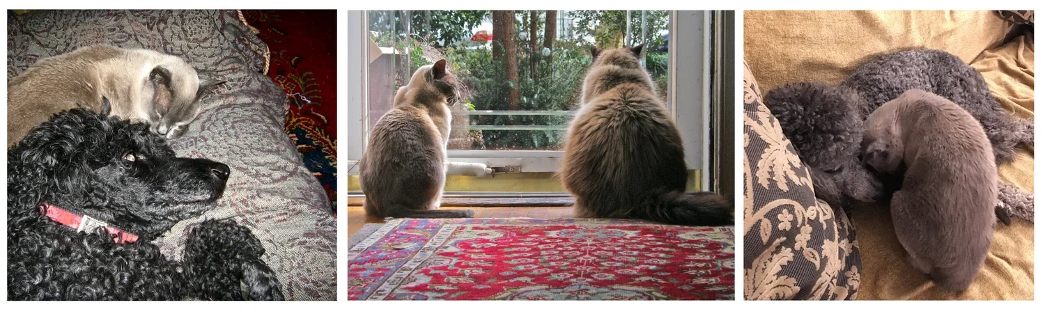 Emma with our first poodle, with Leon who passed about three years ago, and with Gem, our current dog, a couple months ago.