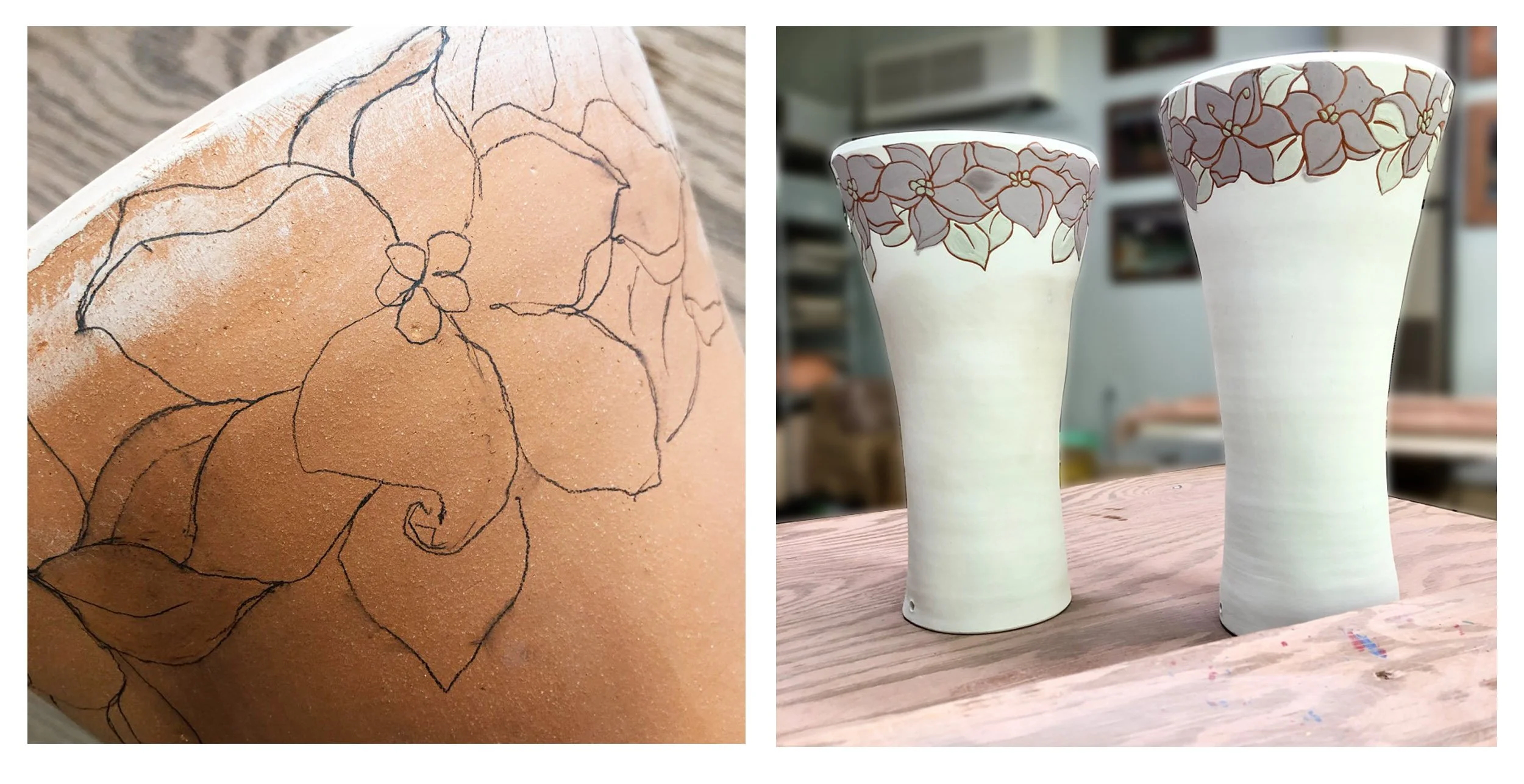 I’ve painted the clay white with underglaze, a ceramic product that comes in many colors usually used under white or clear glazes. These will be glazed amber which would fire brown without the underglaze.