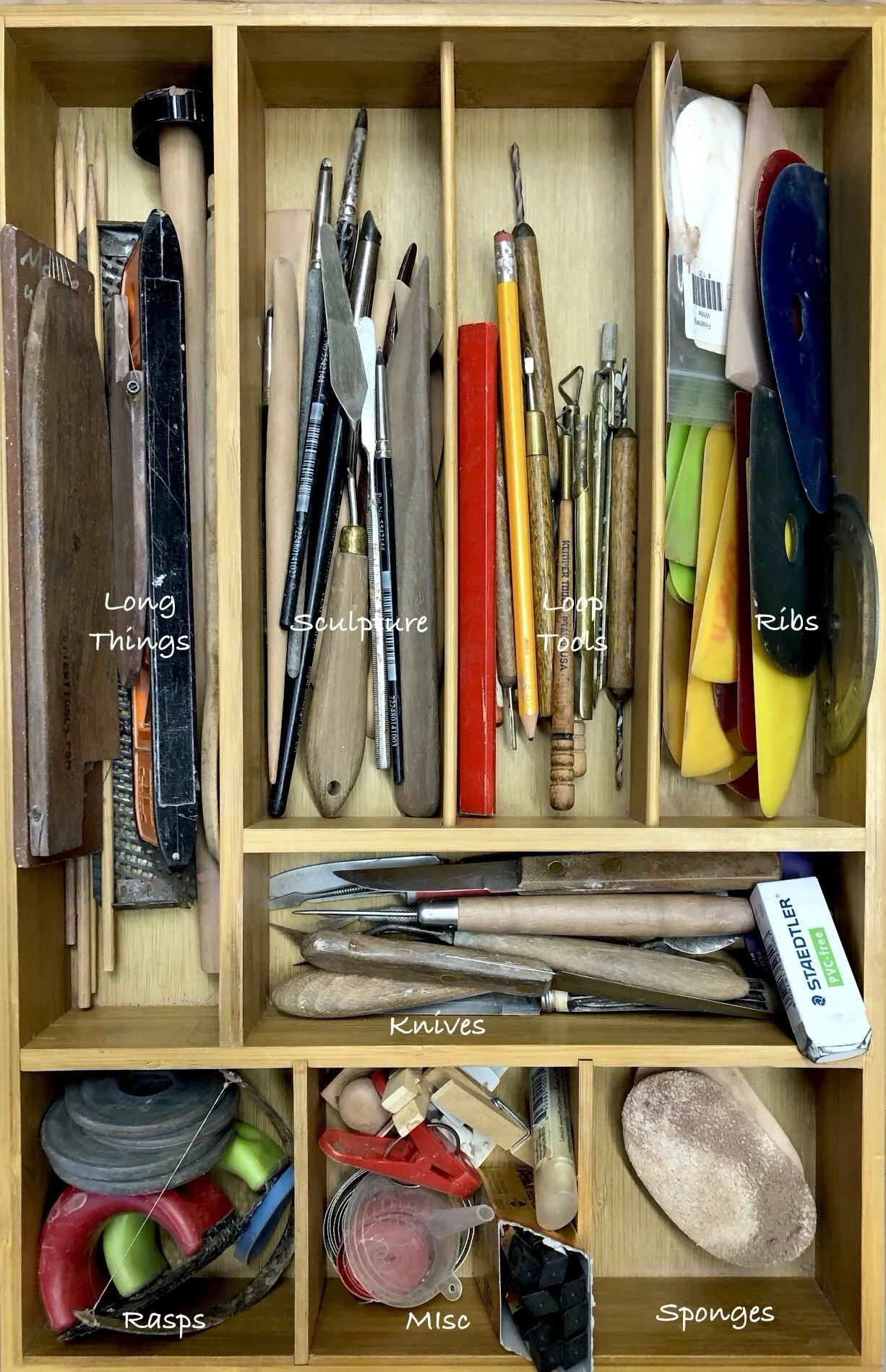 It's the organizing you don't see that makes a space welcoming. I was merciless to my past and released a lot. What's been kept are the things I use now. At this point, most of it's been organized into bins that seemingly disappear. The glazes are in containers that match with neatly printed labels. I now have some desperately needed empty shelves. I've been using the tabletops to store works in progress like birdhouses and coiled vessels. Now they have a safe place to dry without having to be moved around.